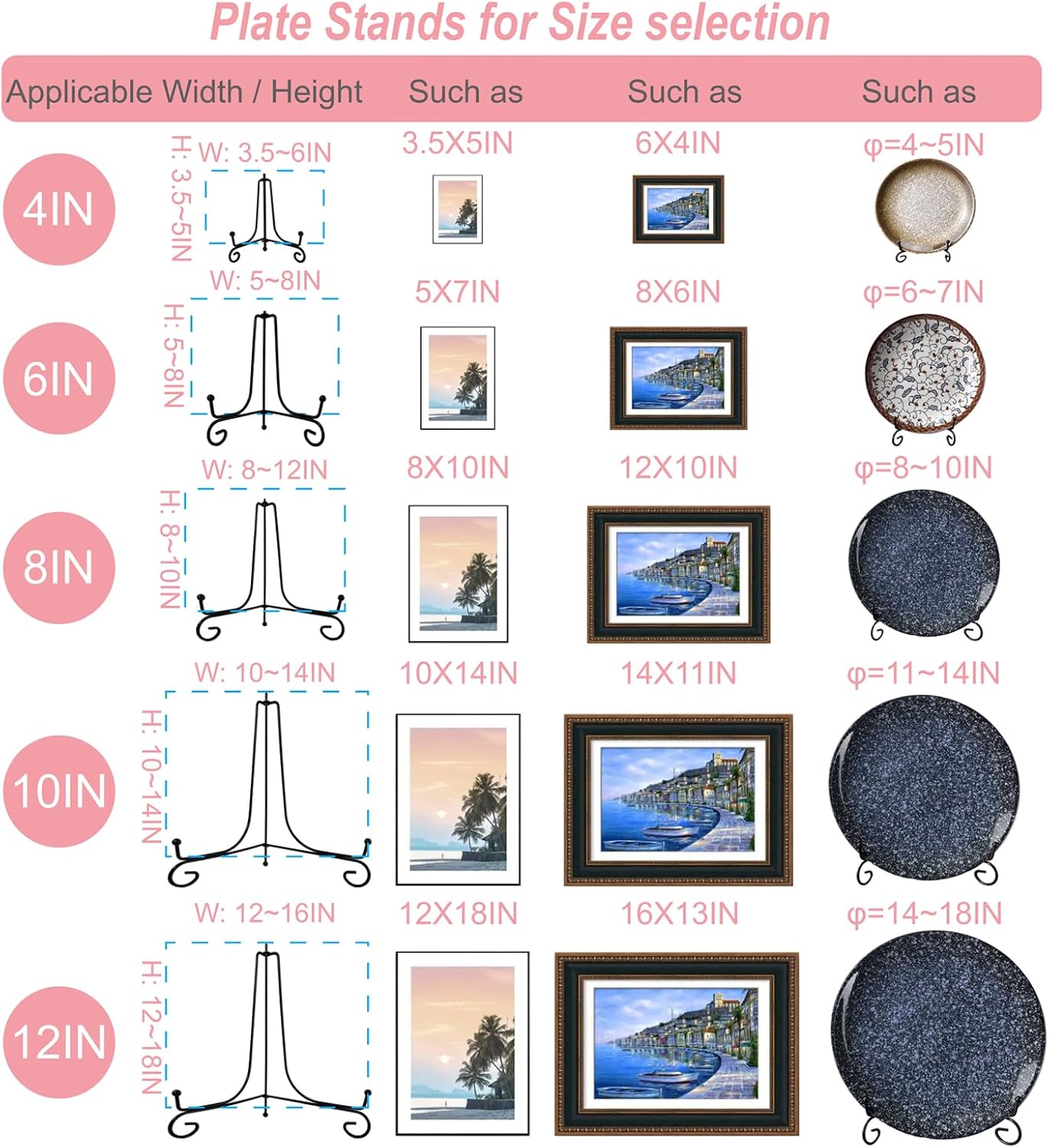 • Choose The Right Size: 4 Inch plate display stands are suitable for items of Rectangle 3.5 - 5 Inch Height / Wide and Round φ=4 - 5 IN Diameter. Plate holders for displaying are made of solid metal wire and black spray paint resistant to corrosion