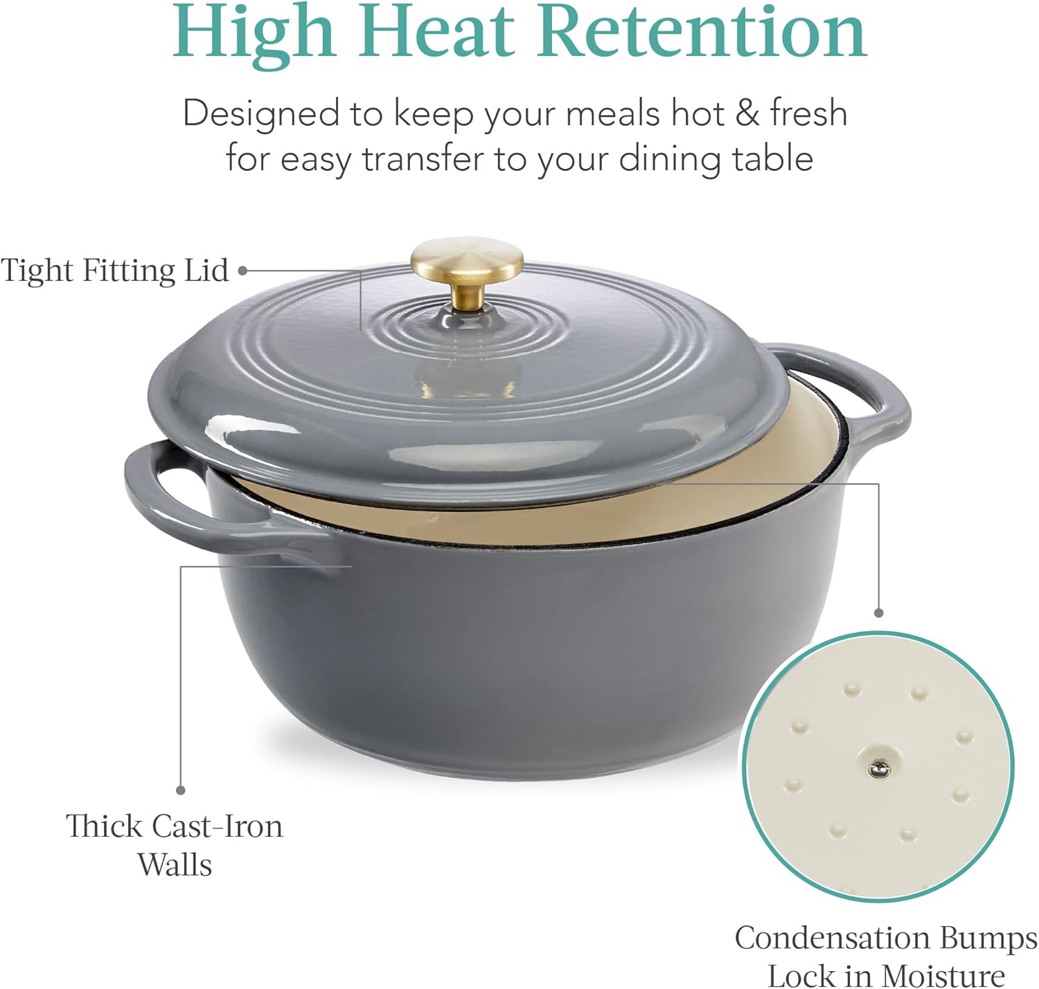 • HIGH HEAT RETENTION: Built to reach and maintain temperatures up to 480 degrees Fahrenheit, a set of condensation bumps on the heavy lid helps seal in moisture, heat, and flavor