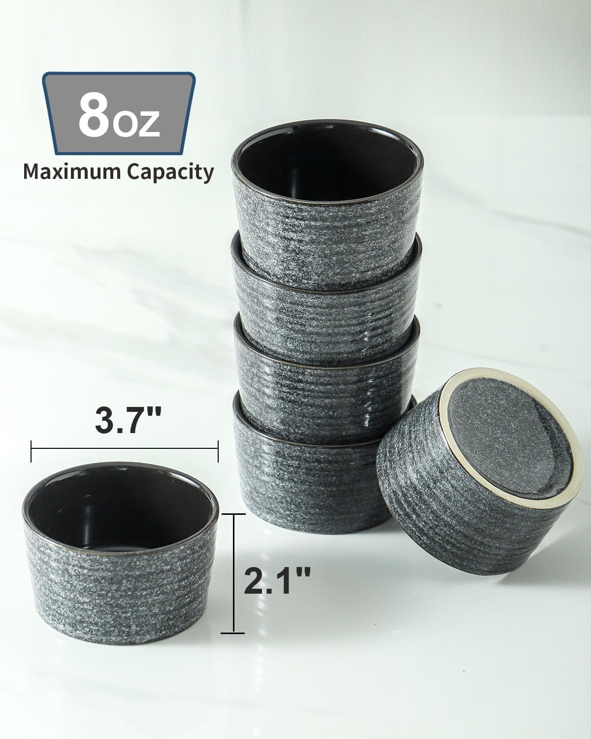 Hasense Ramekins 8 oz Oven Safe for Creme Brulee, Ceramic Souffle Dish Oven Safe Set of 6,Porcelain Dipping Sauce Bowls for Pudding, Creme Brulee, Souffle, Serving Dip, Custard, Ice Cream, Grey