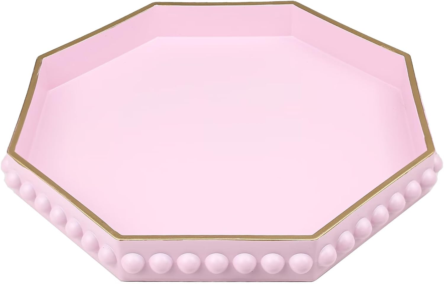 Pink Serving Tray for Coffee Table, Octagonal Beaded Plastic Decorative Tray for Ottoman, Kitchen Counter, Living Room, Outdoor Lacquer Tray for Entertaining