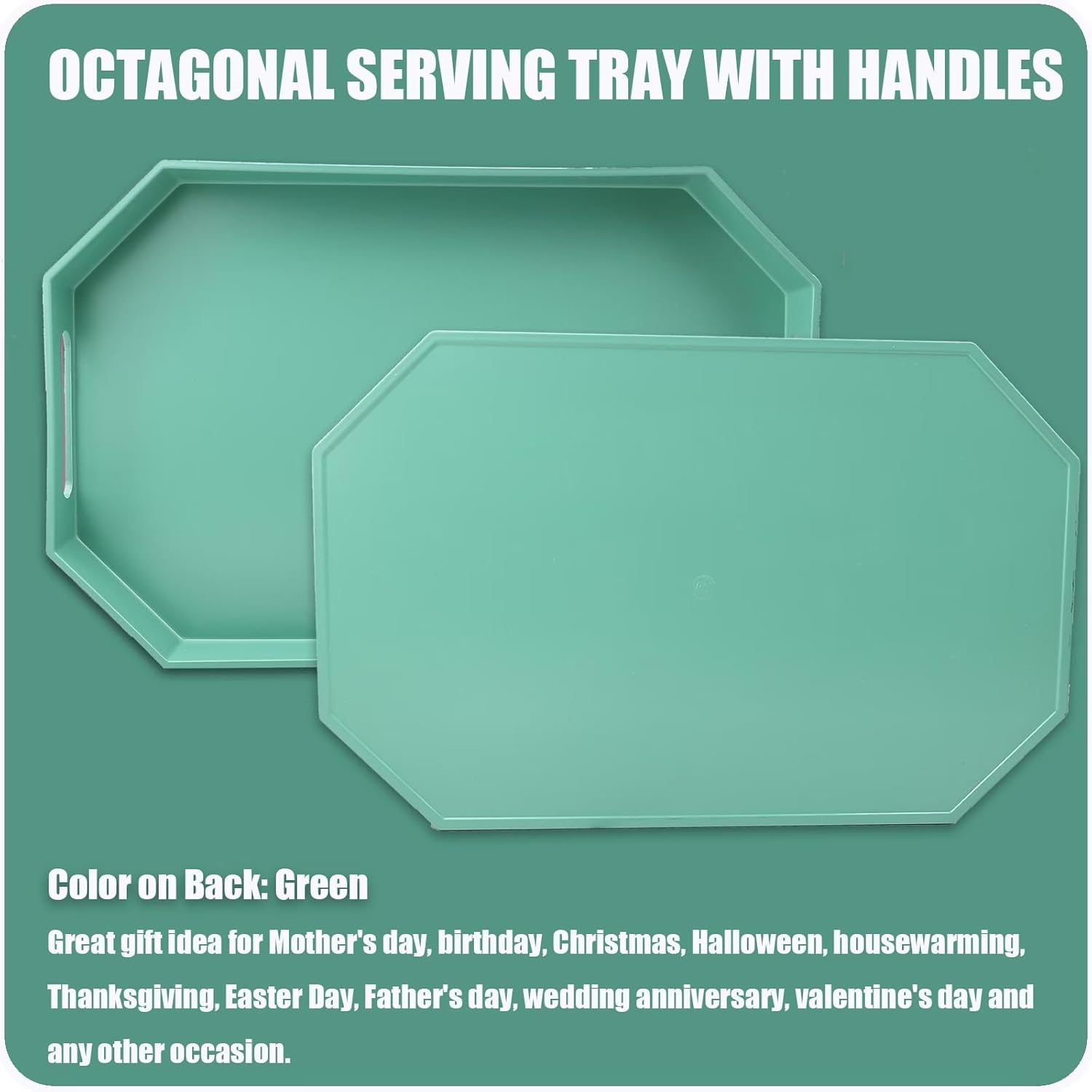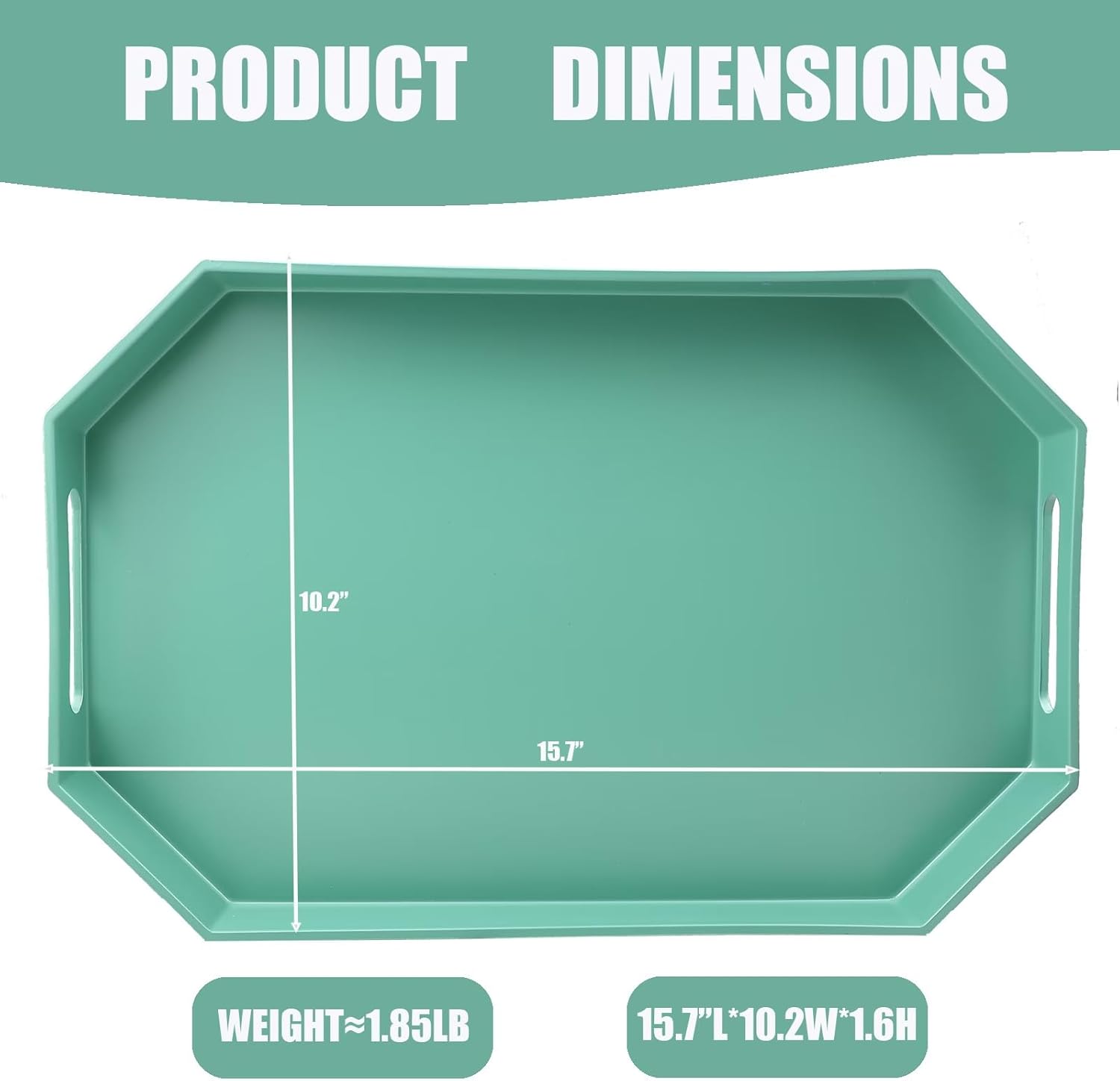 Green Octagonal Serving Tray with Handles for Coffee Table, Plastic Decorative Tray for Ottoman, Kitchen Counter, Living Room, Outdoor Lacquer Tray for Entertaining