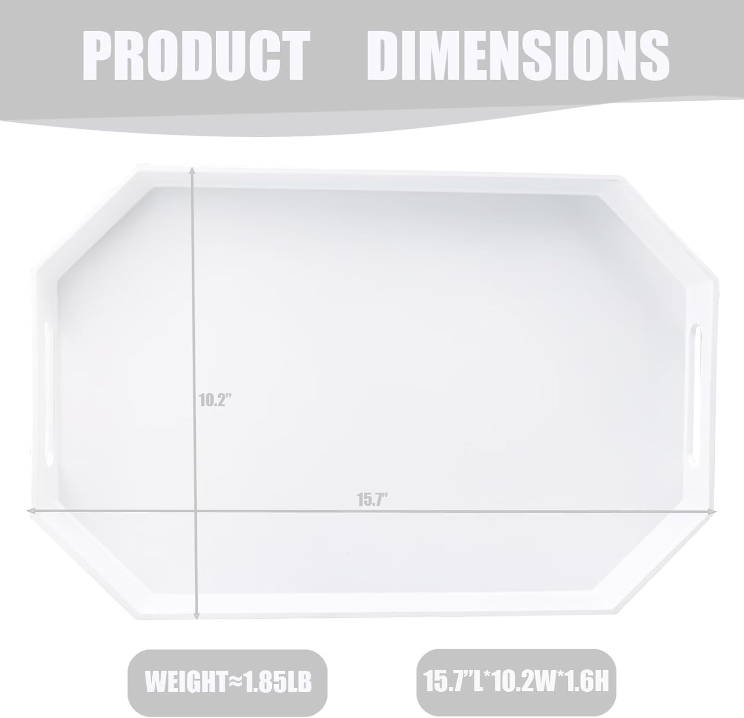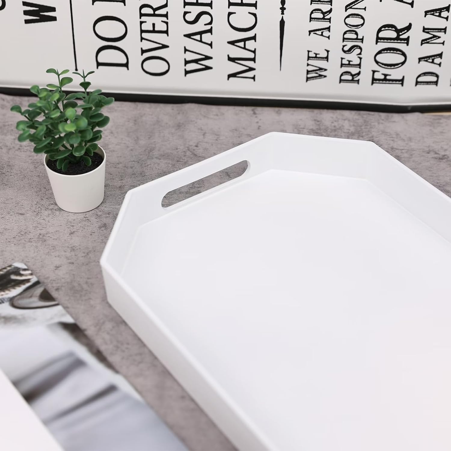 White Octagonal Serving Tray with Handles for Coffee Table, Plastic Decorative Tray for Ottoman, Kitchen Counter, Living Room, Outdoor Lacquer Tray for Entertaining