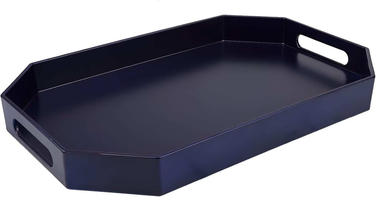 Navy Blue Octagonal Serving Tray with Handles for Coffee Table, Plastic Decorative Tray for Ottoman, Kitchen Counter, Living Room, Outdoor Lacquer Tray for Entertaining