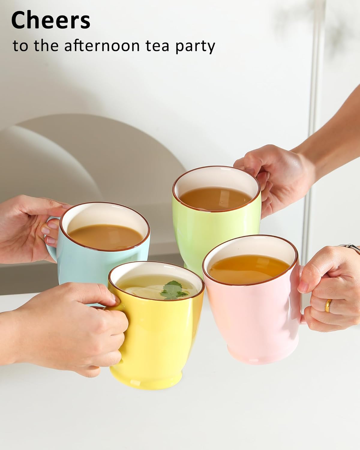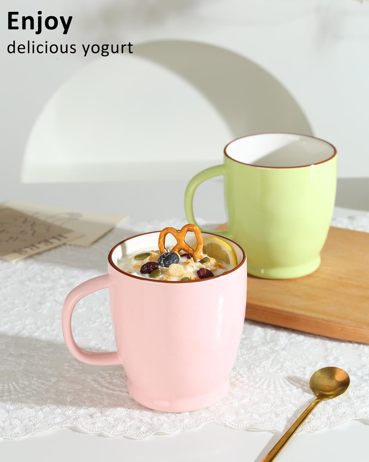 • PERFECT GIFT: This large handle coffee mug comes in a choice of colors, pink, light blue, yellow and green, which are suitable for both men and women. Unique handmade ceramic tea cups are the best gifts for friends, colleagues, lovers and family. Brilliant and rich colors will put you in a colorful mood