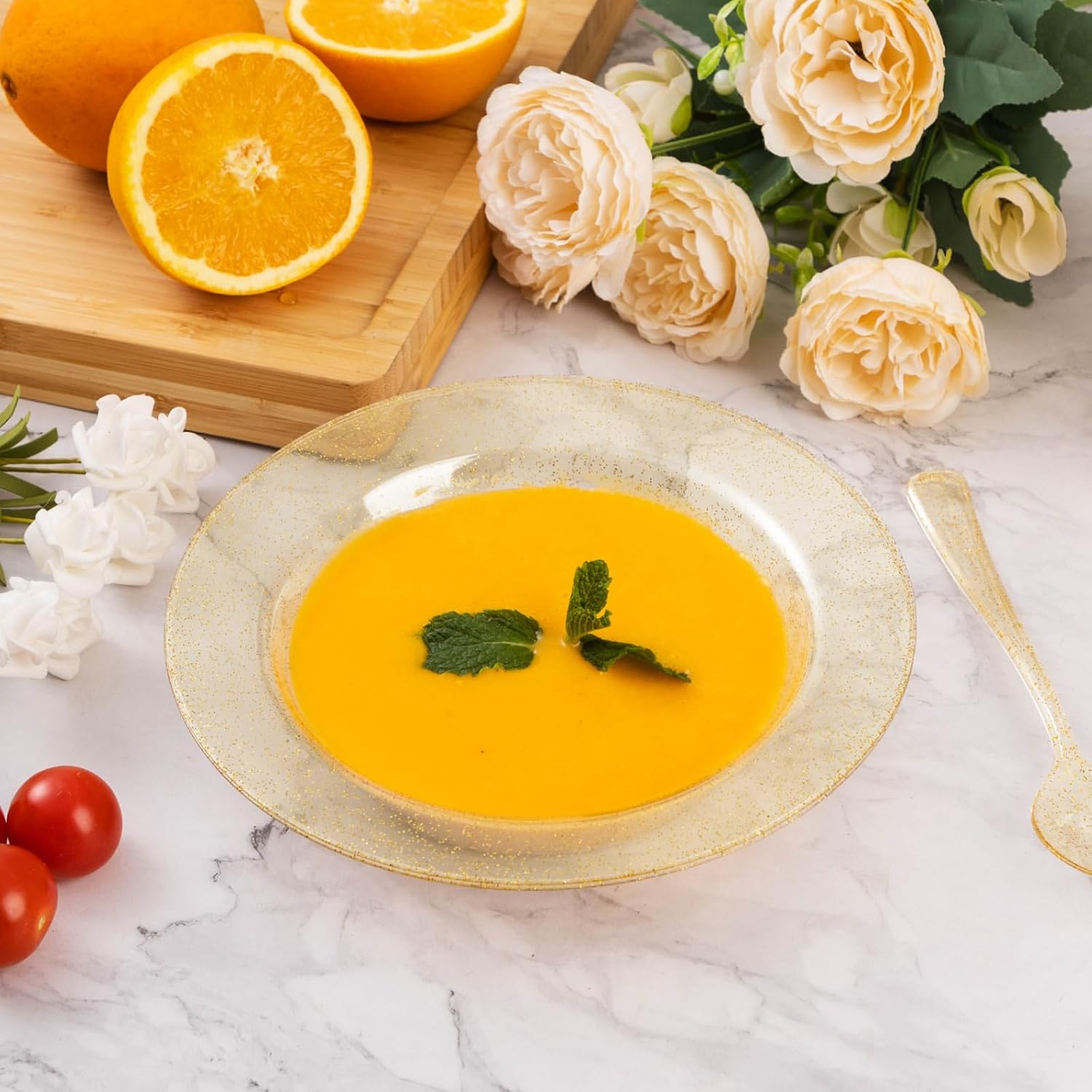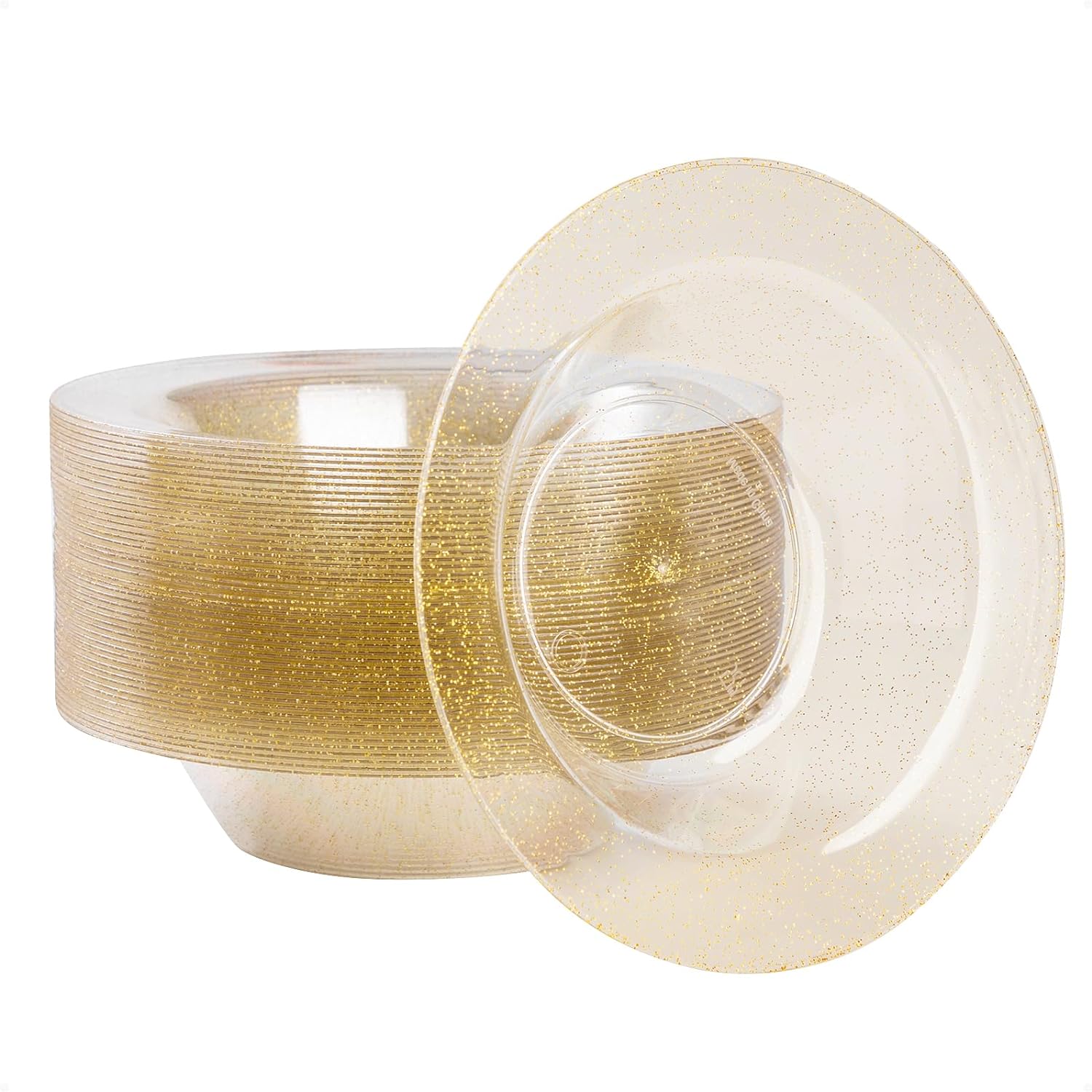 • WHAT YOU GET - You'll receive a 50-piece set of 12oz glitter bowls disposable, perfect for serving your family or guests. These dessert bowls are ideal for serving appetizers, desserts, candies, fruit, salads, hot soup, ice cream sundaes, breakfast cereals, and more, providing your guests with a convenient experience.