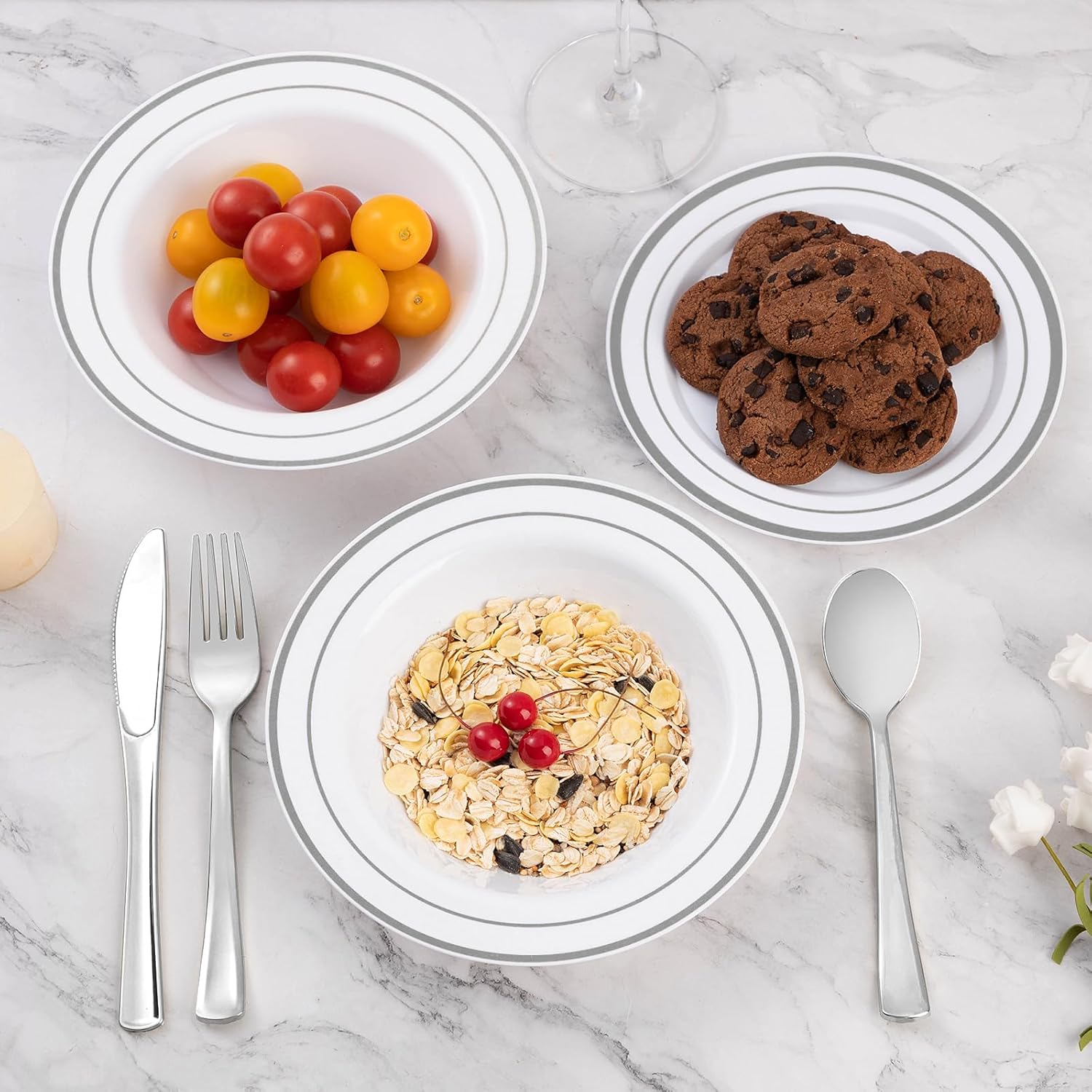 • ELEGANT DESIGN - The plastic disposable bowls with a silver rim have a premium appearance, resembling porcelain, which can be paired with a variety of colored dinnerware for all occasions. With disposable bowls for party, you can easily host a party without worrying about clean-up at the end. You can throw them in the trash after use.