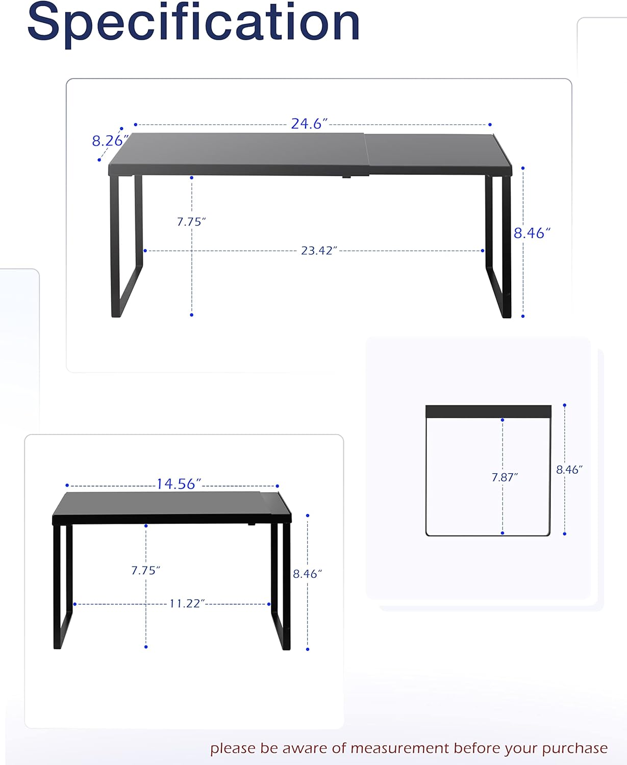 • SPECIFICATION: 8.26’’D * 14.56-24.6’’W * 8.46’’H. If you purchase 2 of these expandable shelves set you can stack one of top of another thereby creating a two-tier storage space. Easy to assemble with a clear manual.