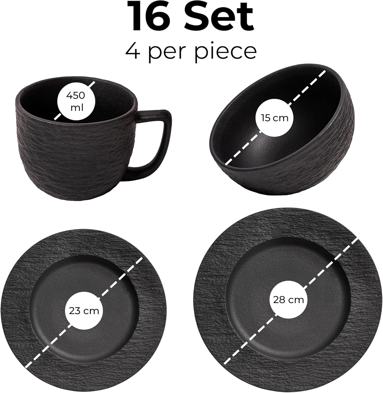 • πŸπŸ”-ππˆπ„π‚π„ πƒπˆπππ„π‘π–π€π‘π„ 𝐒𝐄𝐓- Our black tableware set, consisting of cups, plates and bowls, brings style and functionality to your kitchen. The set consists of 4 stylish coffee cups (15oz), 4 generous bowls (25.5oz) and 4 small (9 inch) and 4 large (11 inch) plates in a matt black colour.