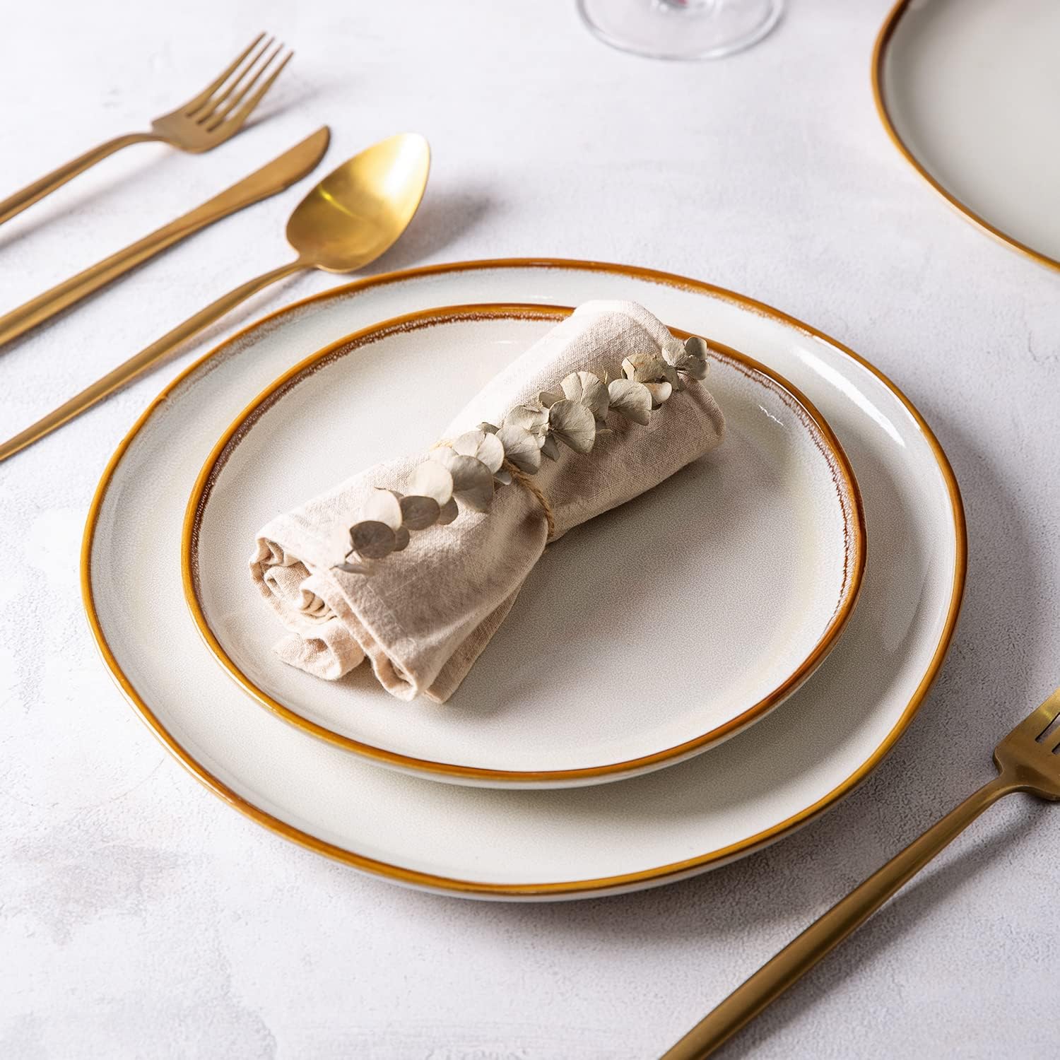 • EVERY PLATE IS UNIQUE: This dinerware set are fired with two different glazes, so the surface develops a beautiful color and makes your food look even more delicious.The reactive glaze make every plate is unique, Since our glaze is all-natural, the surface of plates would change color on different lighting. The color may be a tad different from what you see in the image,but very item is betiful.Our glaze is also extra strong to prevent scratches from your knives and forks.