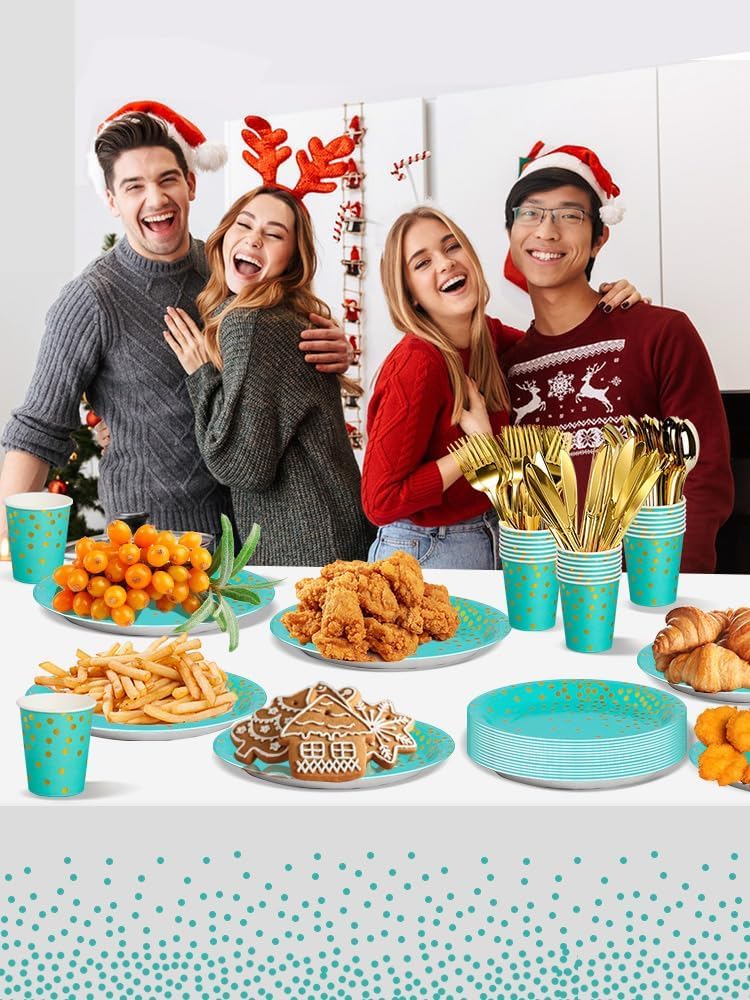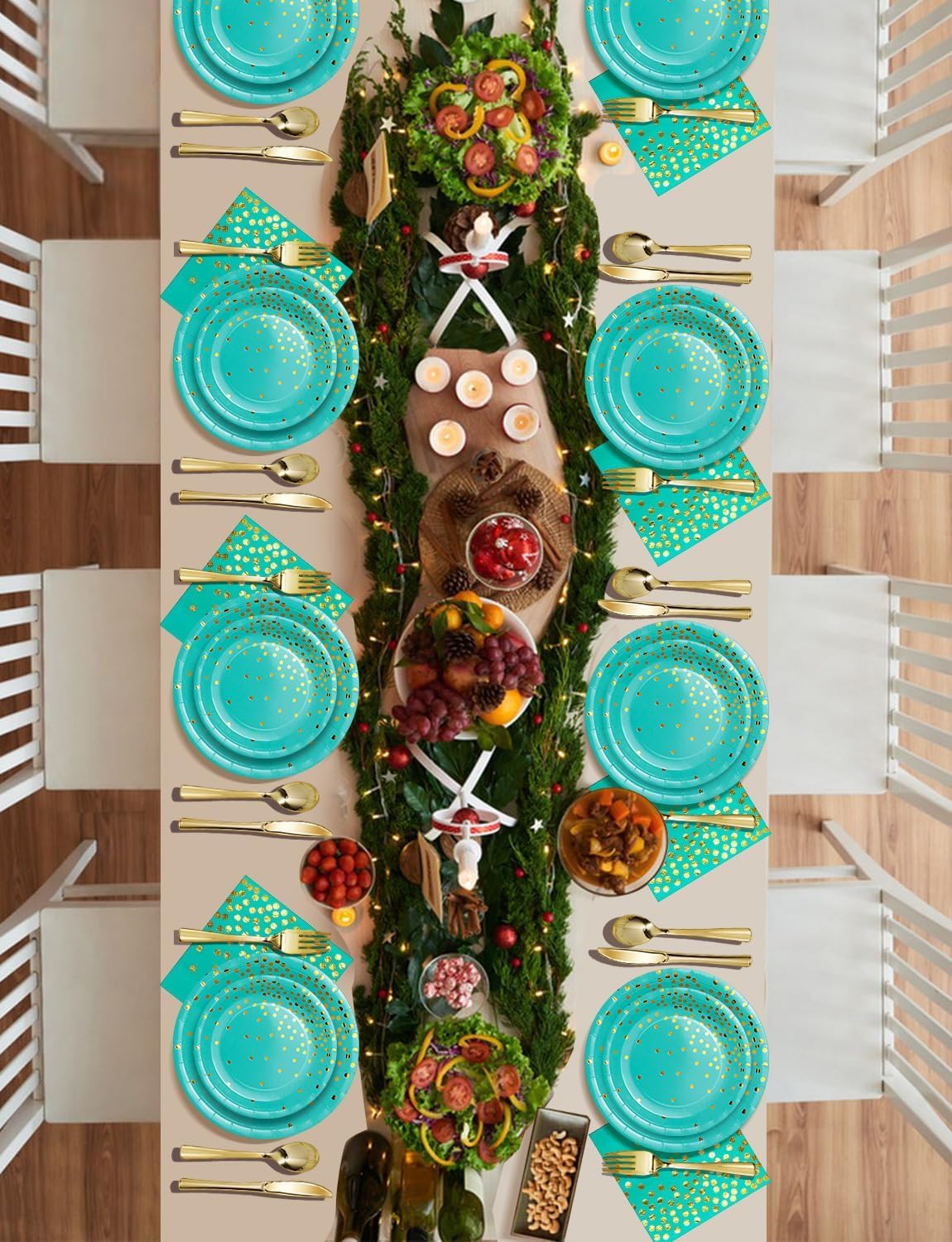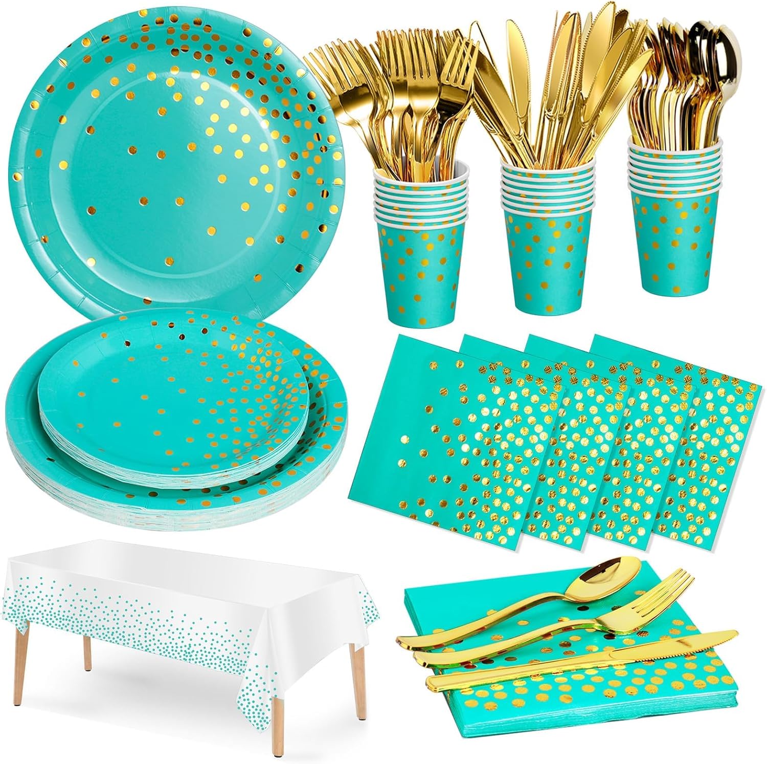 • 🍰【High Quality and Elegant Design】Our party supplies pack features a Blue green background and gold foil polka dot pattern, adding a touch of sophistication to your event. Made of 100% food-grade paper, our plates are sturdy and can hold heavy foods without bending or breaking. All party dinnerware are made of BPA-free, non-toxic, and tasteless plastic that is very strong and won't bend or break.