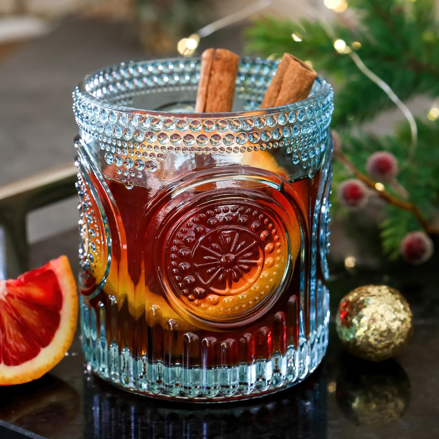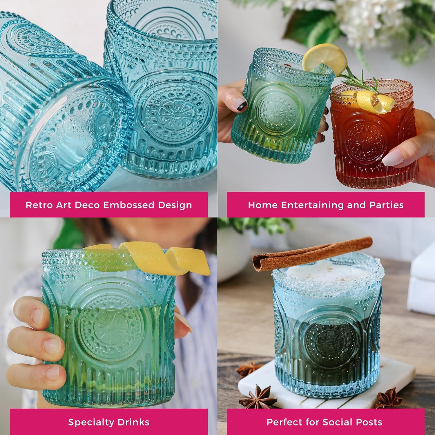 • Transport yourself back in time with our vintage-inspired drinking glasses, meticulously designed and embossed to evoke a sense of nostalgia. Whether serving cocktails, mocktails, or signature drinks, these glasses are the epitome of timeless elegance. Perfect for displaying on a bar cart, accentuating exposed cupboards, or enhancing floating shelves with their retro charm.