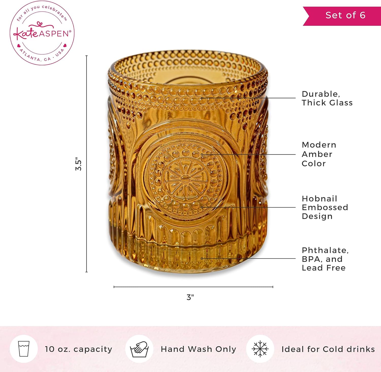 • Vintage-Inspired Drinking Glasses - The Kate Aspen amber drinking glasses set of 6 combines retro elegance with modern durability. Featuring a ribbed retro arch floral pattern, these 10 oz glasses are perfect for cocktails, juice, water, iced coffee, or sweet tea. Comfortable to hold with a beautiful weight, they add vintage charm to any table setting, bar cart, or open shelving display, making them a standout choice for both everyday drinking water and special occasions.