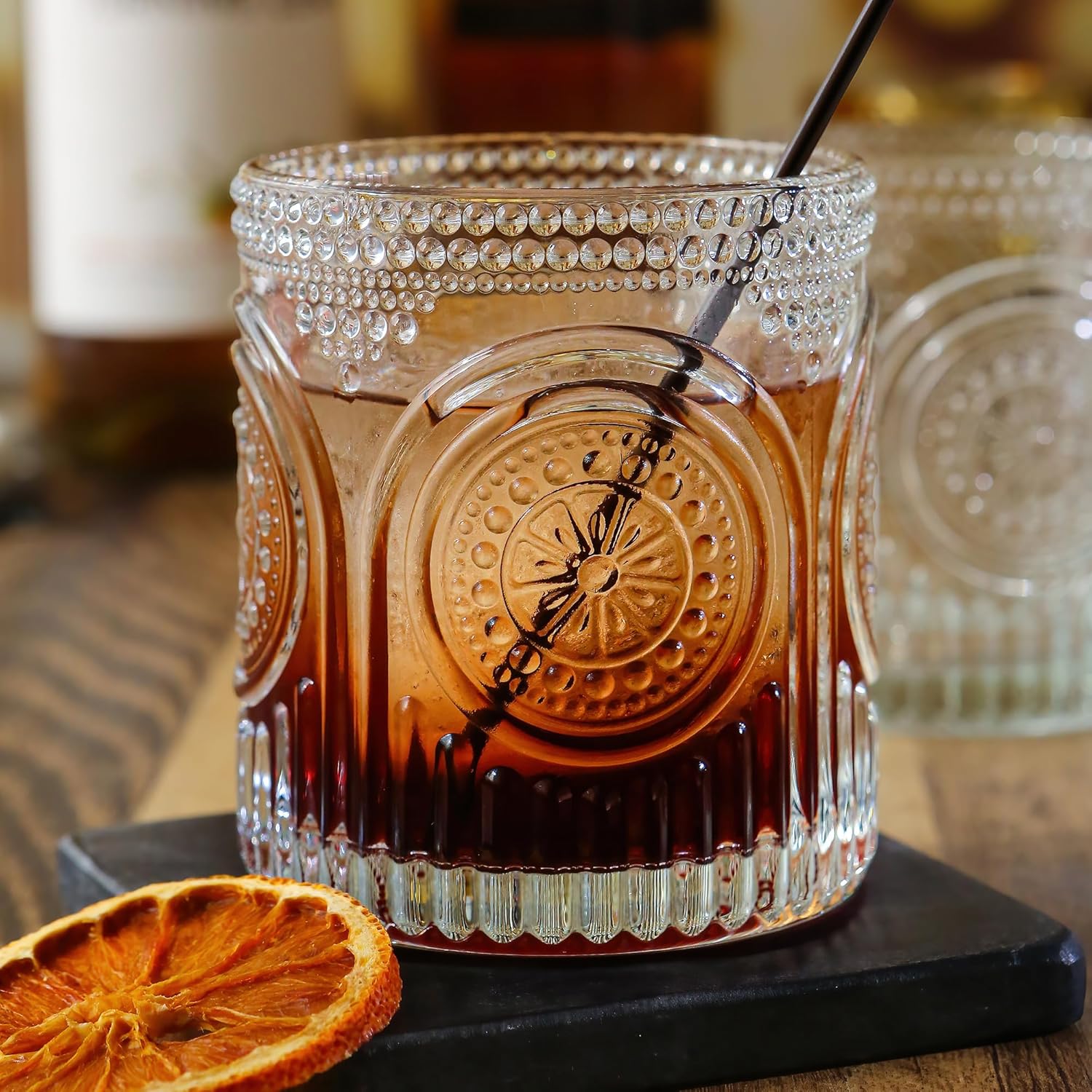 • Vintage-inspired design and embossing that are long lost to bring you a glass that you will be proud to serve your guest with! They will elevate every cocktail or signature mocktail. They look great on a bar cart or with exposed cupboards. Great for floating shelves or behind your favorite bar.