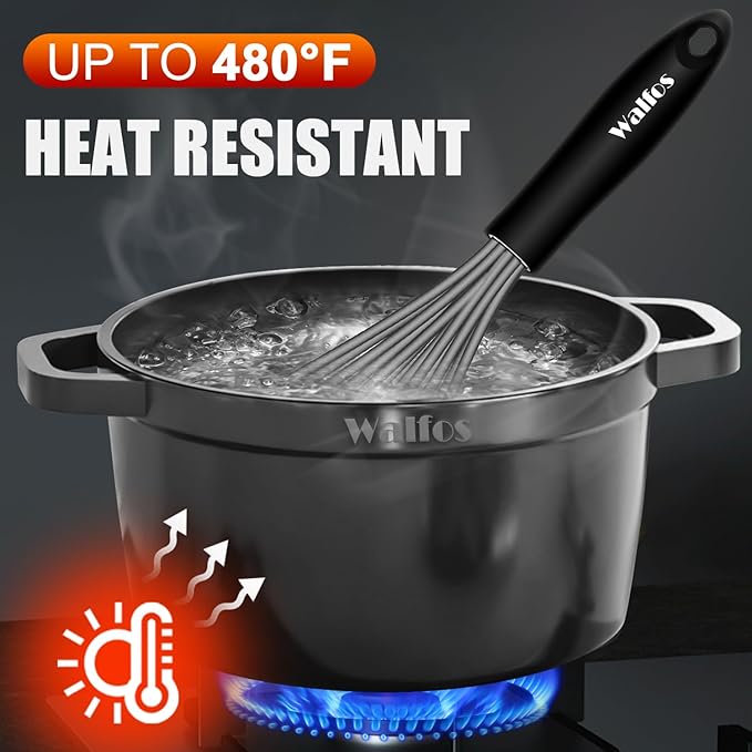 • NON SCRATCH COATED-Walfos whisk is made of 1.65 mm durable stainless steel with wires coated in 0.3 mm soft silicone, wisk will not damage or scratch any of your pots, pans, bowls,or other dishes while you cook your favorite meals! BPA free, not rust, discolor, deform or melt. The ultimate accessory for nonstick coated baking.
