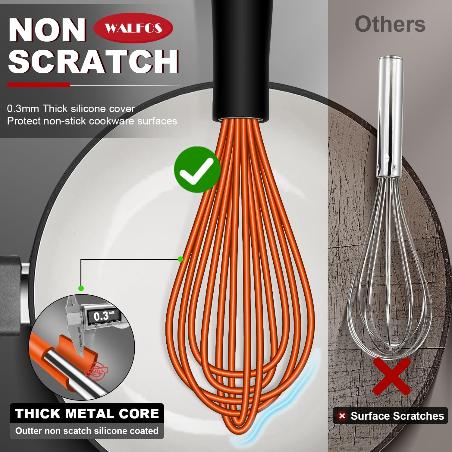 Walfos Whisk, Silicone Whisks Set of 5, Mini Stainless Steel Whisk 7+5in and Non Scratch Coated 7+9+11in Whisks, Suitable for Blending, Whisking, Beating, Frothing & Stirring. (Orange)