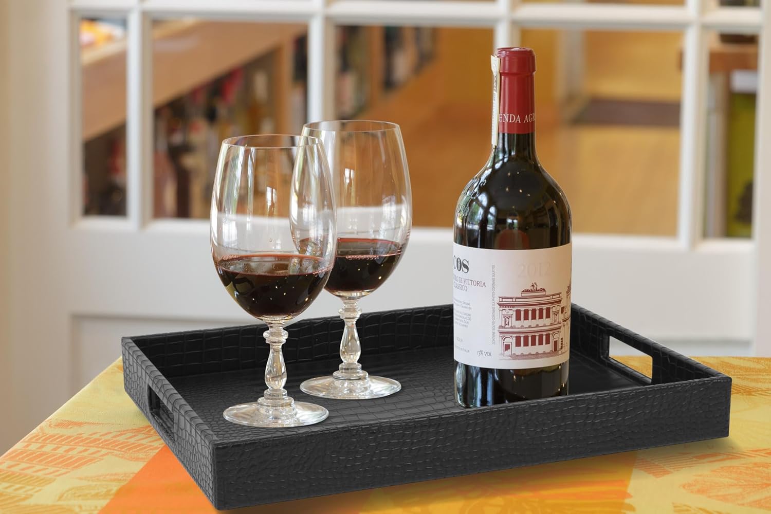HofferRuffer Rectangle Serving Tray with Hole Handles for Coffee Table, Breakfast, Tea, Food, Butler - Countertop, Kitchen, Vanity Serve Tray, 16.2 x 12.2 x 2 inches, Faux Leather (Black Croco)