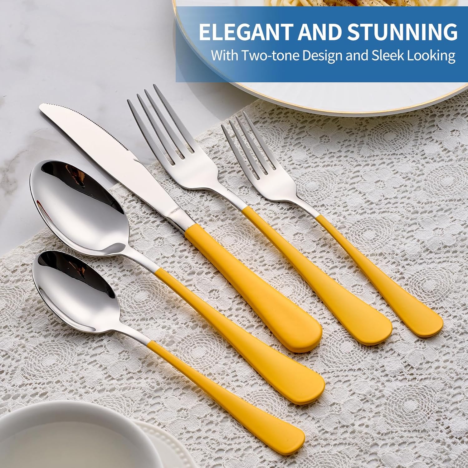 20-Piece yellow Silverware Set, 18/0 Stainless Steel yellow Handle Flatware Set, Service for 4, Modern Cutlery Set Includes Dinner Knives Forks Spoons, Mirror Polished, Dishwasher Safe