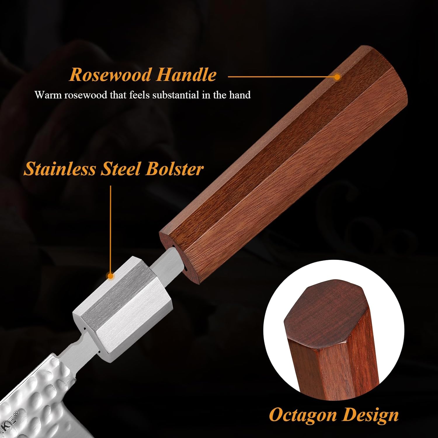 • 【Ergonomic rosewood Handle】The handle of this Japanese style knife set is constructed from natural rosewood that feels substantial in the hand, smooth and warm. Moreover, an ultra-thick octagonal bolster forged from premium stainless steel acts as a seamless junction between the handle and the knife blade, not only strengthening the kitchen knife but also providing a smooth transition from the meat cutting knife blade to the handle