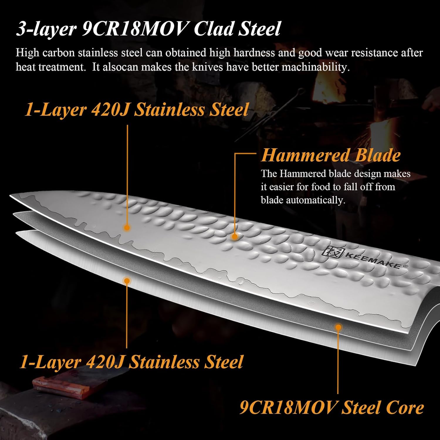 • 【Premium Material】This KEEMAKE chef knife set is crafted out of 3-layer Japanese 9CR18MOV superior stainless steel, clad by high quality stainless steel from both sides. Japanese 9CR18MOV stainless steel has what all chefs are looking for: excellent edge retention, corrosion resistance,ease at resharpening, and hardness