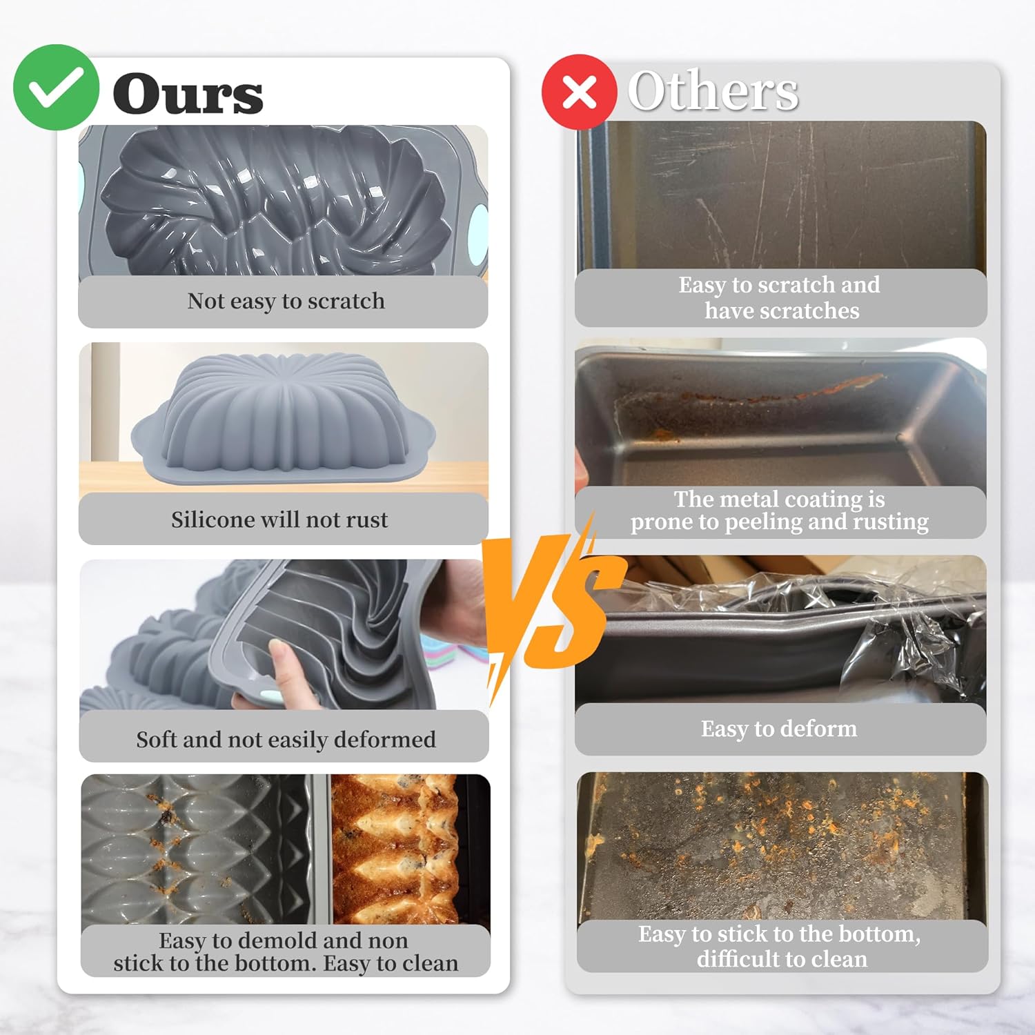 • Food Grade Silicone - These eco-friendly silicone molds are made of food grade silicone, completely safe to use, resistant to high temperatures up to 446°F. No more melting, cracking and worrying.