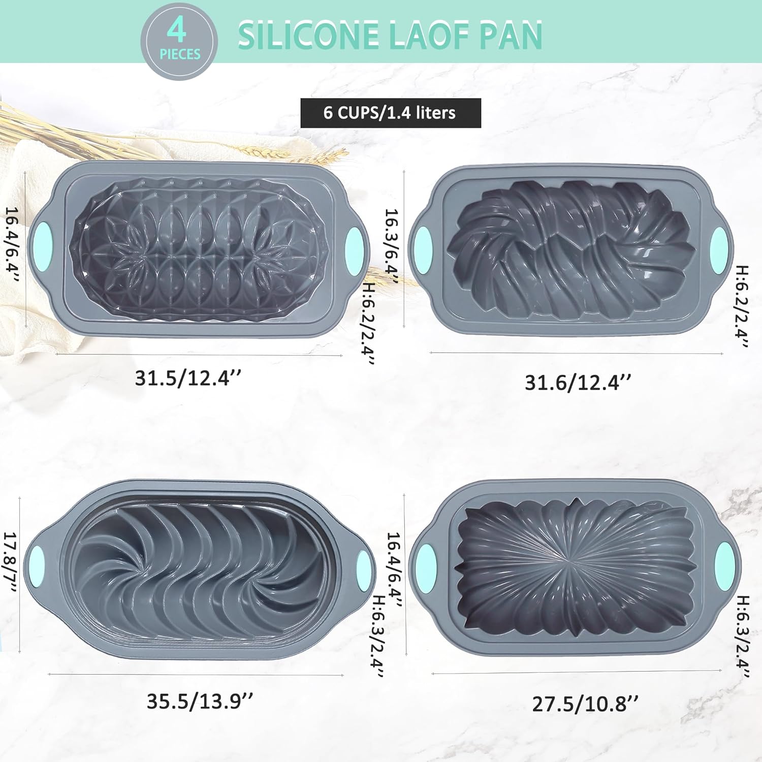 Tongjude 4 Piece Silicone Loaf Pan for Baking, Non-Stick Kitchen Oven Bread Pan, Perfect for Banana Bread, Sandwich, Pound Cake and Meatloaf, 6 Cups, Grey