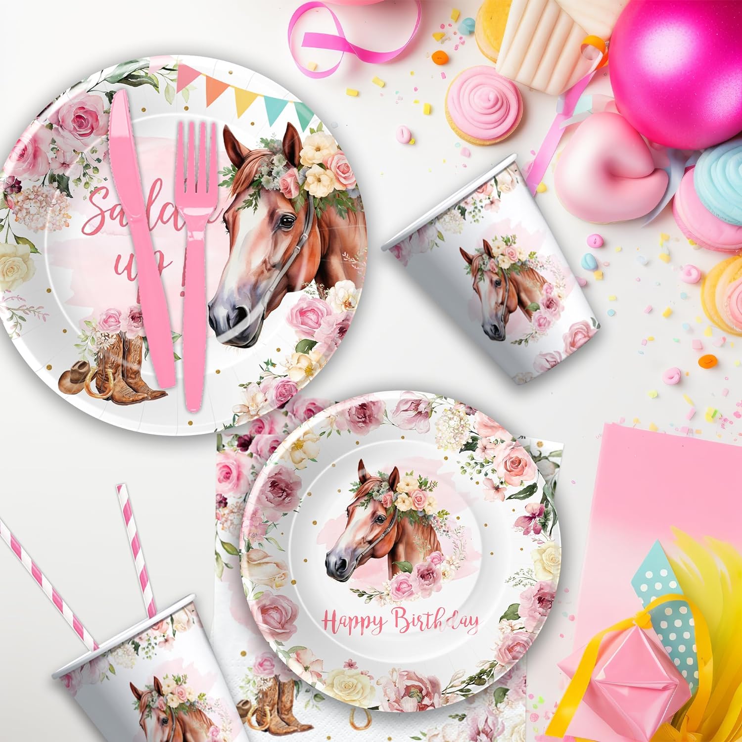 Cowgirl Party Decorations Tableware - Western Horse Birthday Party Supplies For Girl, Plate, Napkin, Fork, Tablecloth, Wild West Cowgirl Birthday Baby Shower Decorations Dinnerware | Serve 24
