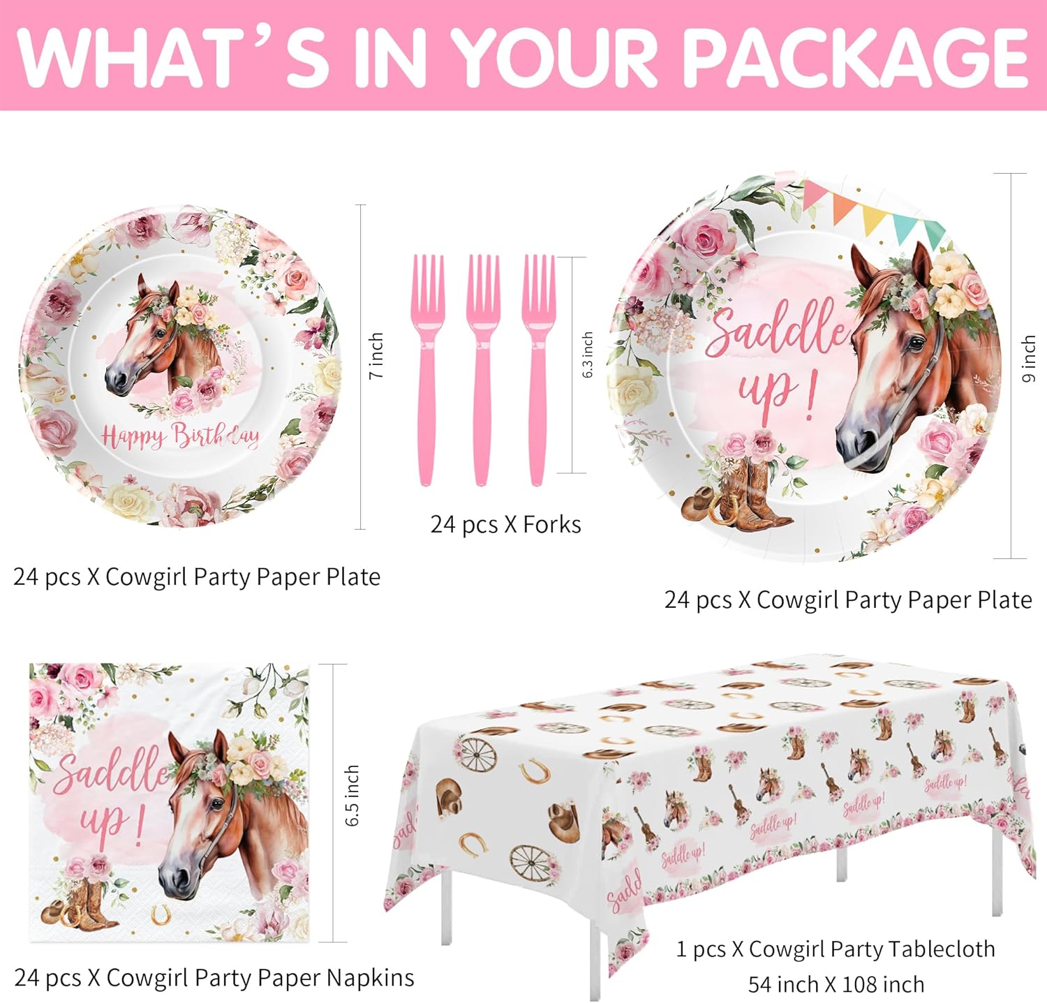 • 【What Will You Get】Disposable cowgirl horse party decorations dinnerware set included 24pcs 9'' cowgirl dinner plates, 24pcs 7'' wild west dessert plates, 24pcs paper napkins, 24pcs disposable forks, 1pcs western cowgirl tablecloth, for cowgirl birthday decorations