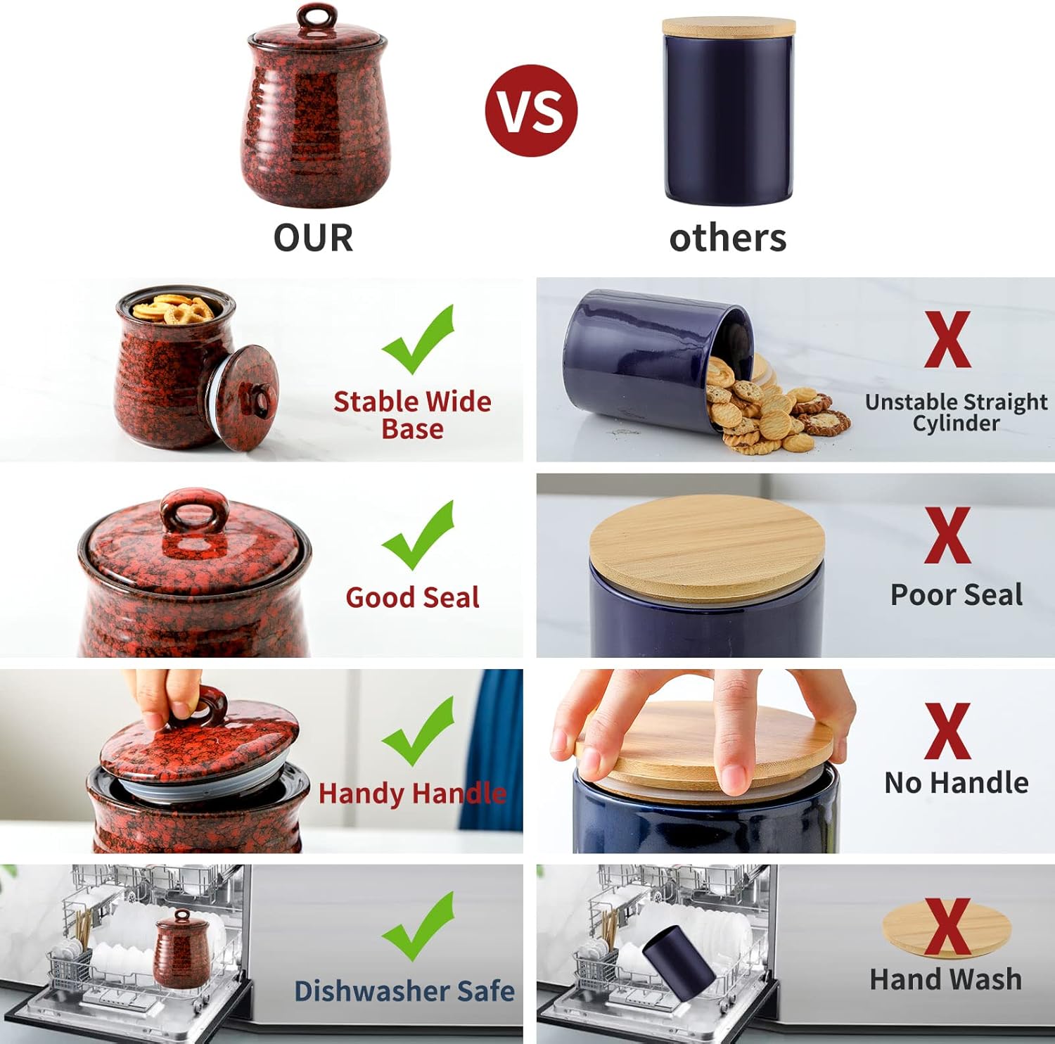 • Safe and Harmless Lead-Free Ceramic Material: Tikooere food storage jars are made of safe and harmless lead-free ceramic material, which not only makes it more environmentally friendly, but also is more durable and less likely to break than plastic and glass, thereby ensuring that the stored food Always in a safe state.