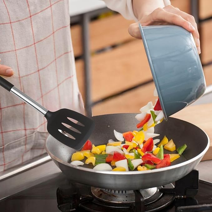 • Easy to Clean and Maintain: The non-stick silicone surface not only makes cooking easier but also simplifies the cleaning process. The Silicone Utensils are dishwasher safe, allowing for convenient and efficient cleanup after use. The durable construction ensures that the utensils maintain their quality over time, providing a reliable and long-lasting addition to your kitchen cookware collection