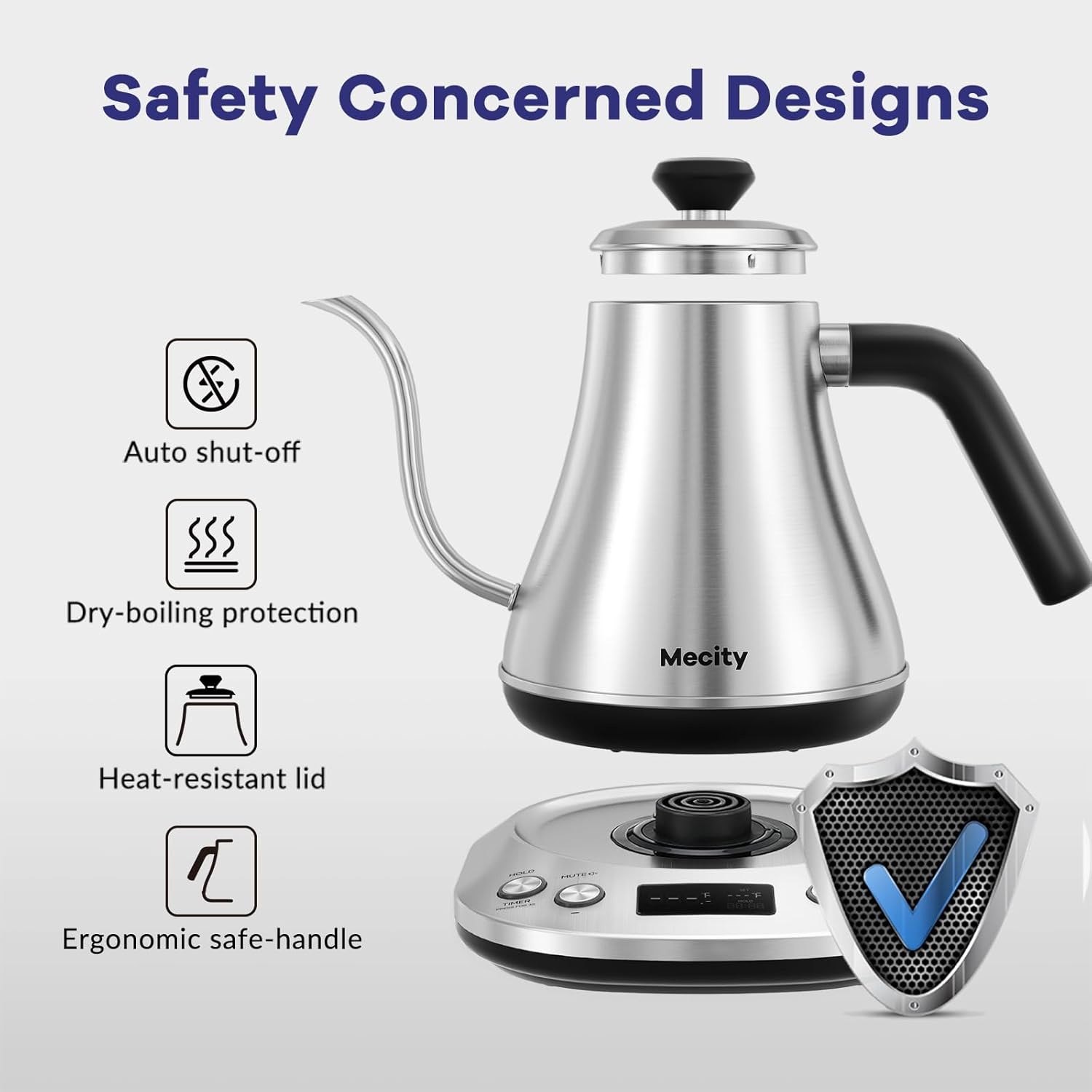 • Multiple Protection For Your Safety: or safety reasons, our kettle is equipped with an anti-dry function, automatic shut-off mechanism, and an insulated handle. The kettle will automatically shut off when the pot reaches desired temperature or when there is no water inside. The handle and lid are heat resistant and sturdy
