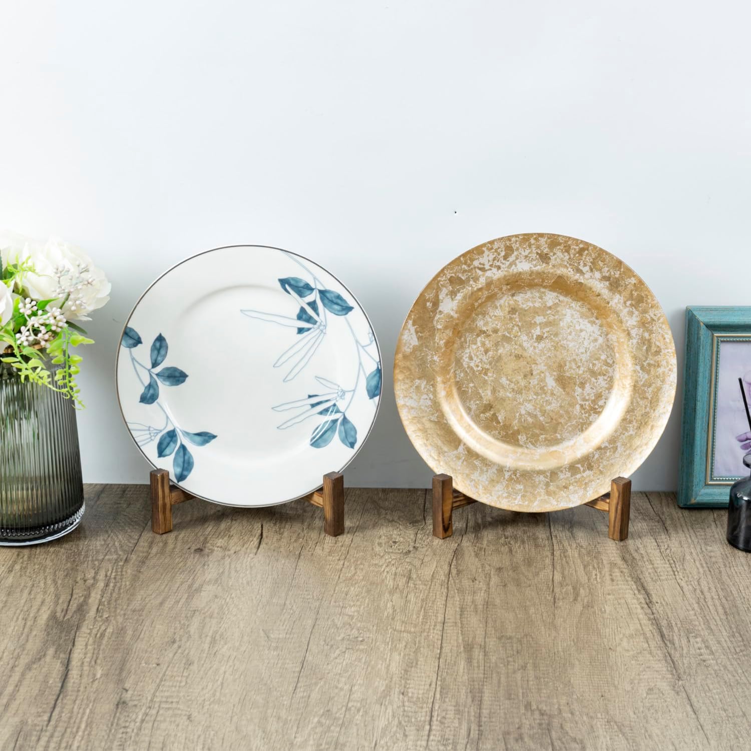 MyGift 11 Inch Plate Display Stands, Rustic Burnt Solid Wood Tabletop Racks for Collectible Plates or Saucers, Folding Picture Frame Holder Easels, Set of 2