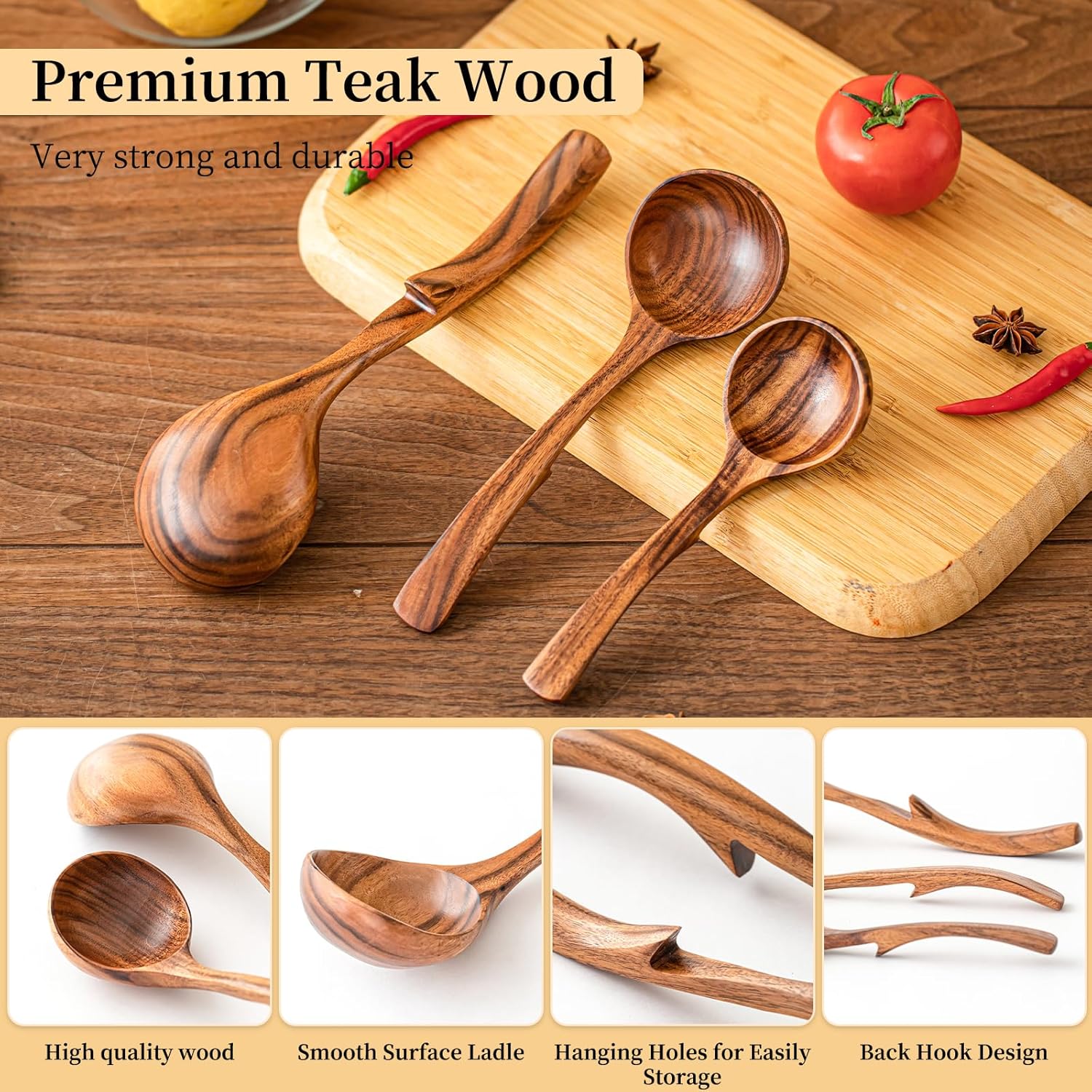 Gudamaye 3 Size Wooden Soup Ladles Set,3 Hooks for Bowl,Pot. Natural Teak Wooden Ladle,10.6 inch Big Soup Ladle, 9 inch Serving Spoon & 8 inch Wood Ladles for Cooking,Teak Deep Ladle Spoons