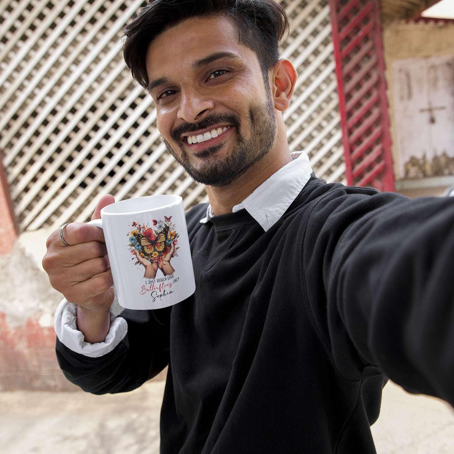 Fantastic Customized I Just Really Love Butterflies Coffee Mugs, Custom Butterfly With Hands Travel Cup Present 11oz 15oz, Personalized Name On Animal Tea Cup Gift For Animal Lover