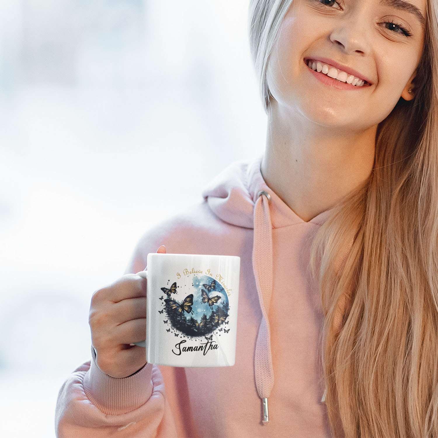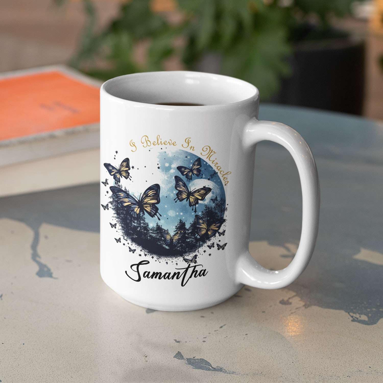 Customized Awesome I Believe In Miracles Tea Cups, Personalized Name On Colorful Butterfly Coffee Mug For Birthday, Custom Unique Ceramic Cup Gift For Animal Lovers 11oz 15oz