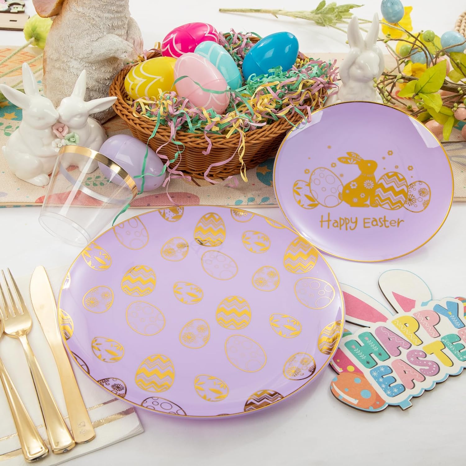 Festiva 175Pcs Easter Plates and Napkins Disposable - Purple and Gold Plastic Dinnerware Set for 50 guests include 50 Plates 25Cups 25Plastic Silverware 25Napkins Perfect for Easter Party