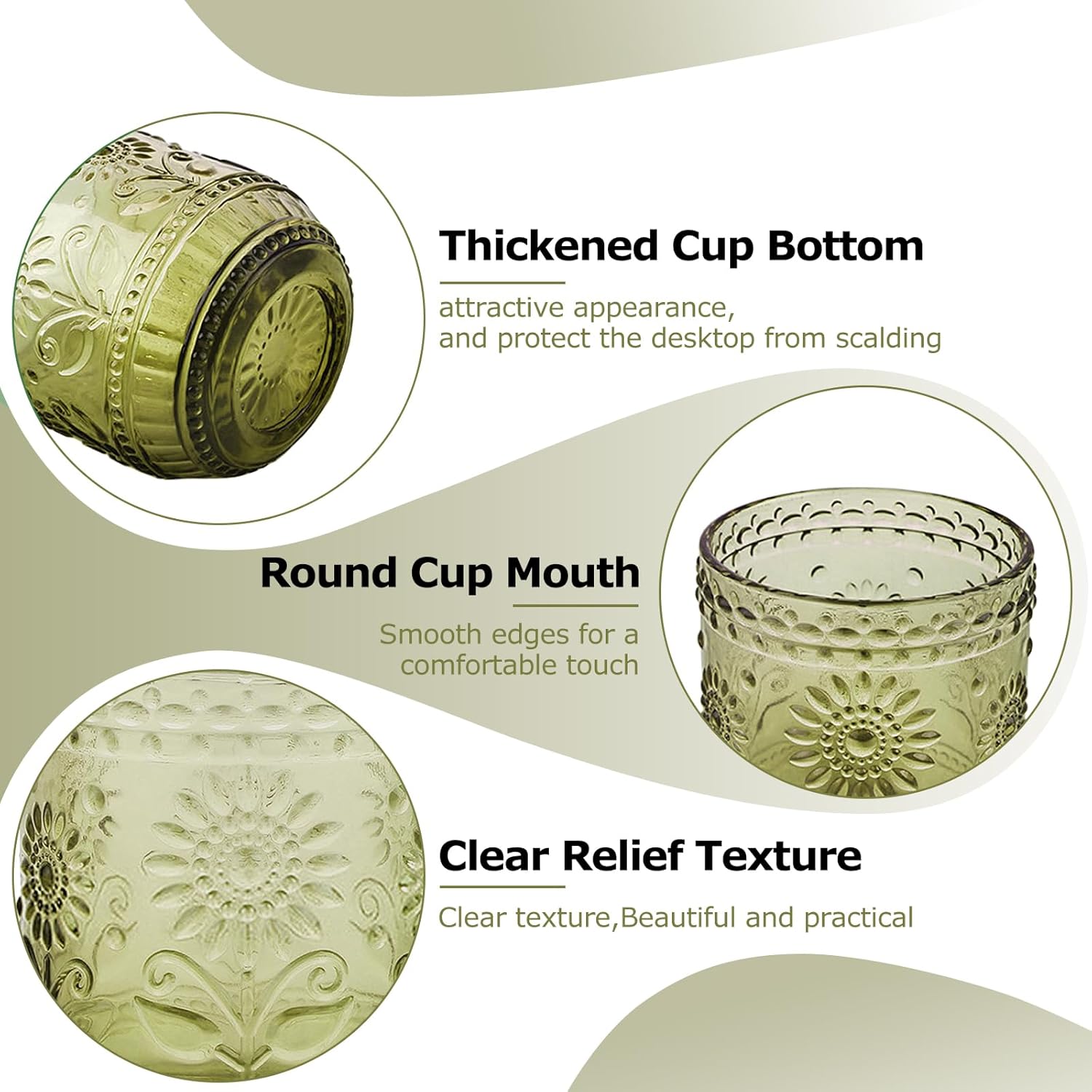 Glass Cups, Vintage Glassware Drinking Glass Set of 4, 12oz Colored Glassware with Sunflower Design, Embossed Floral Decorative Glasses Drinking Set for Beverage, Vintage Drinking Glasses (Green)