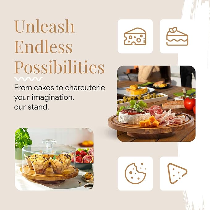 • Lock in Freshness - Whether it's pies, cheese platters, cookies, or a breakfast spread, this wooden cake plate with dome is perfect. The cake spinner stand has a spacious cake cover that keeps cakes moist, pastries crispy, and cheese boards succulent
