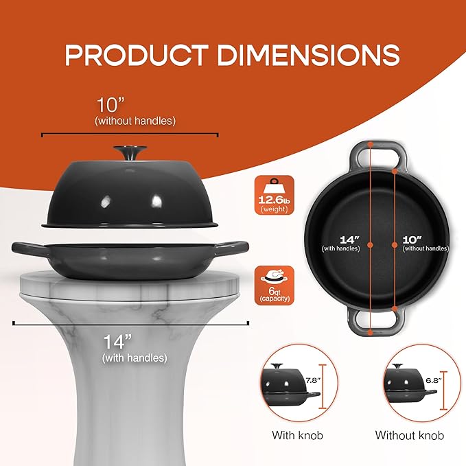 • ULTIMATE DUTCH OVEN SET: Krustic enameled cast iron Dutch oven brings a game-changing innovation to your kitchen! Measuring 14" in diameter with handles, 10" without handles, 7.8" high with the knob, and 6.8" without the knob and weighing 12.6 lbs, this 6 quart pot with lid is a perfect size to create your culinary masterpiece. Our bread oven includes a non-stick, easy-to-clean, dishwasher-safe silicone mat sized 21.4" x 8.2", a care manual, and a homemade recipes book.