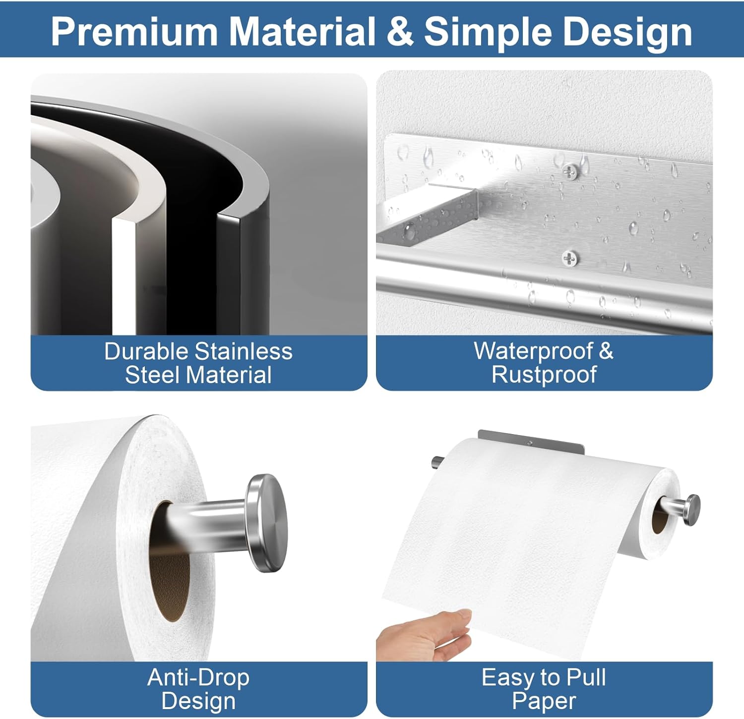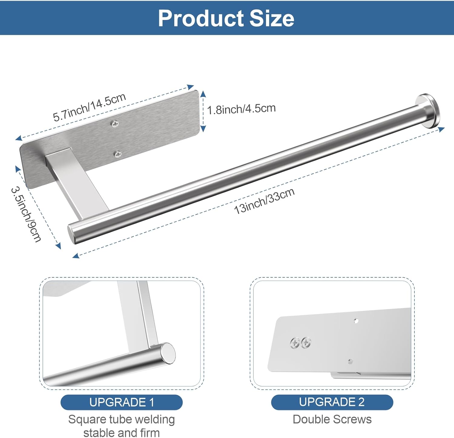Paper Towel Holder Under Cabinet, Upgraded Adhesive Paper Towel Holder Wall Mount for Kitchen, Bathroom, RV, Bend-Resistant, Self-Adhesive or Drill mounting, Stainless Steel, Silver