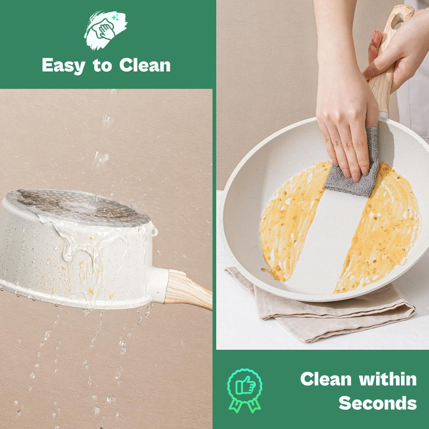 • Easy Cleaning – Spend Less Time Scrubbing, More Time Cooking. Simply wipe with a sponge or rinse under water to clean these pans sets—no soaking, no scrubbing, no stress.