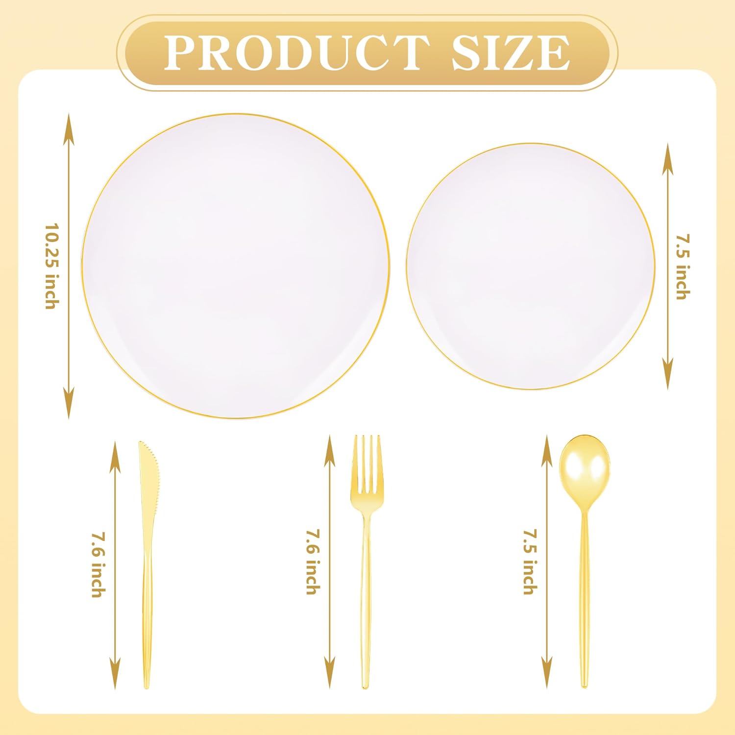 • CONVENIENT & REUSABLE: Gold dinnerware set include 30 gold dinner plates, 30 gold salad plates, 30 gold plastic silverware (30 gold knives, 30 forks, 30 spoons). Save yourself clean-up time with these disposable gold plates. You can choose to disposable these gold rimmed plastic plates directly or use them again after hand washing.