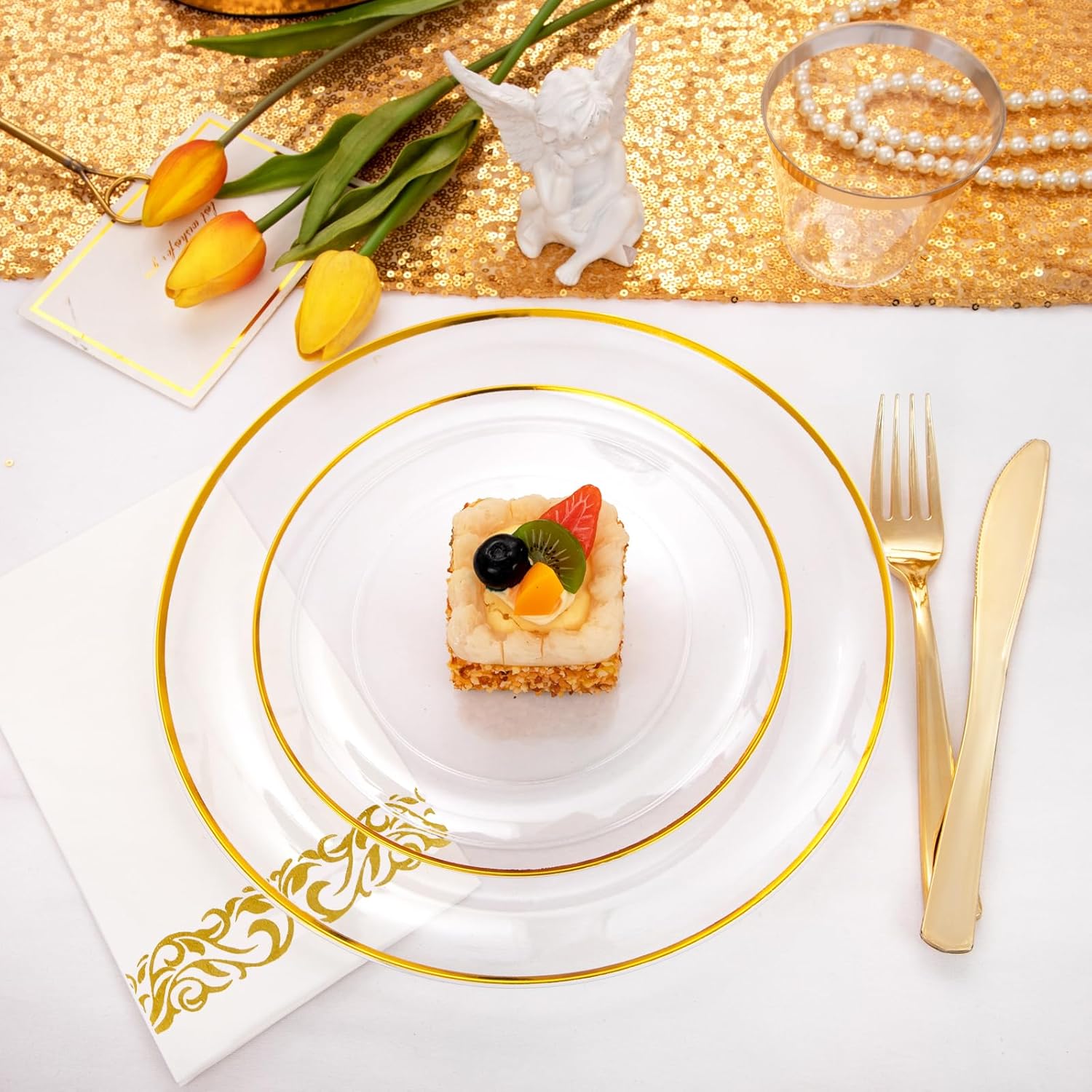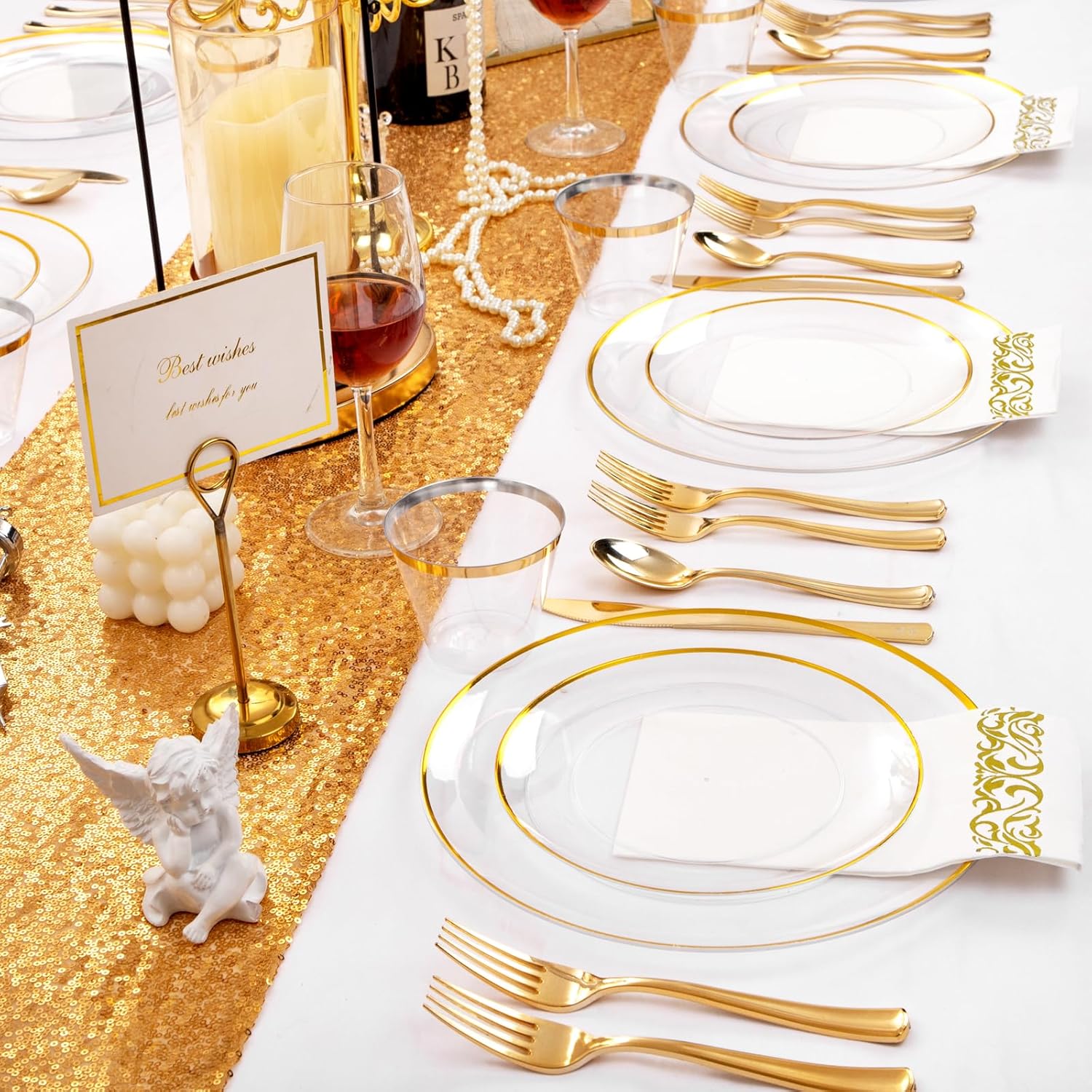 • PERFECT FOR 50 GUESTS: Our clear and gold plastic plates include 50 dinner Plates, 50 dessert/salad Plates, 150 gold plastic cutlery, 50 gold plastic cups and 50 napkins. These clear gold disposable plates can make an amazing dining experience for 50 guests.