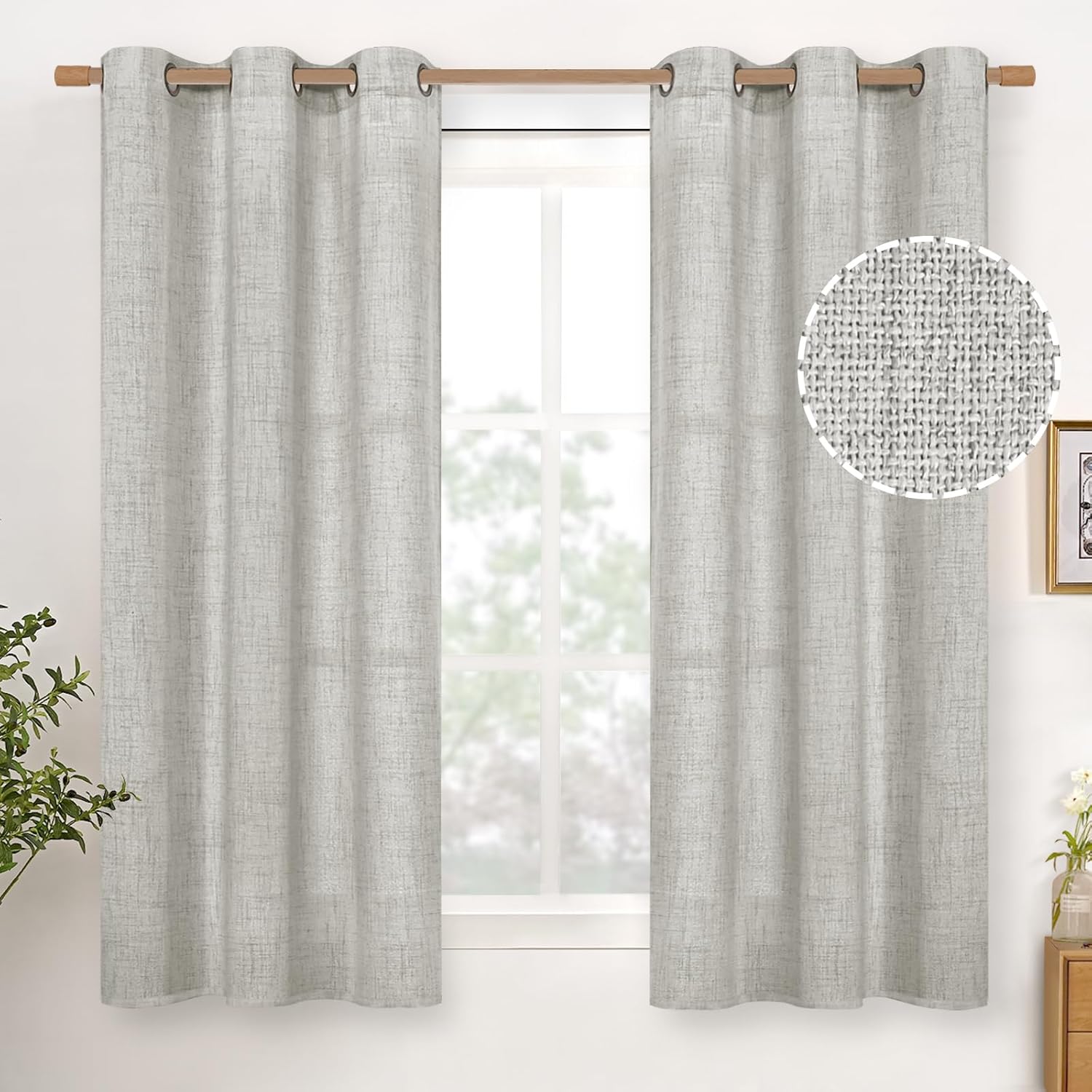 YoungsTex Light Grey Linen Curtains 45 Inch Length for Kitchen Bathroom Window, Short Semi Sheer Drapes with Bronze Grommet Light Filtering for Living Room Bedroom, 42 X 45 Inch, 2 Panels