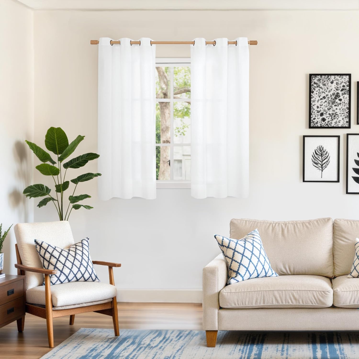 YoungsTex 48 Inch Length White Semi Sheer Curtains for Short Window, Light Filtering Linen Drapes with Bronze Grommet for Kitchen Bedroom Bathroom Decorative Privacy, 42 X 48 Inch, 2 Panels