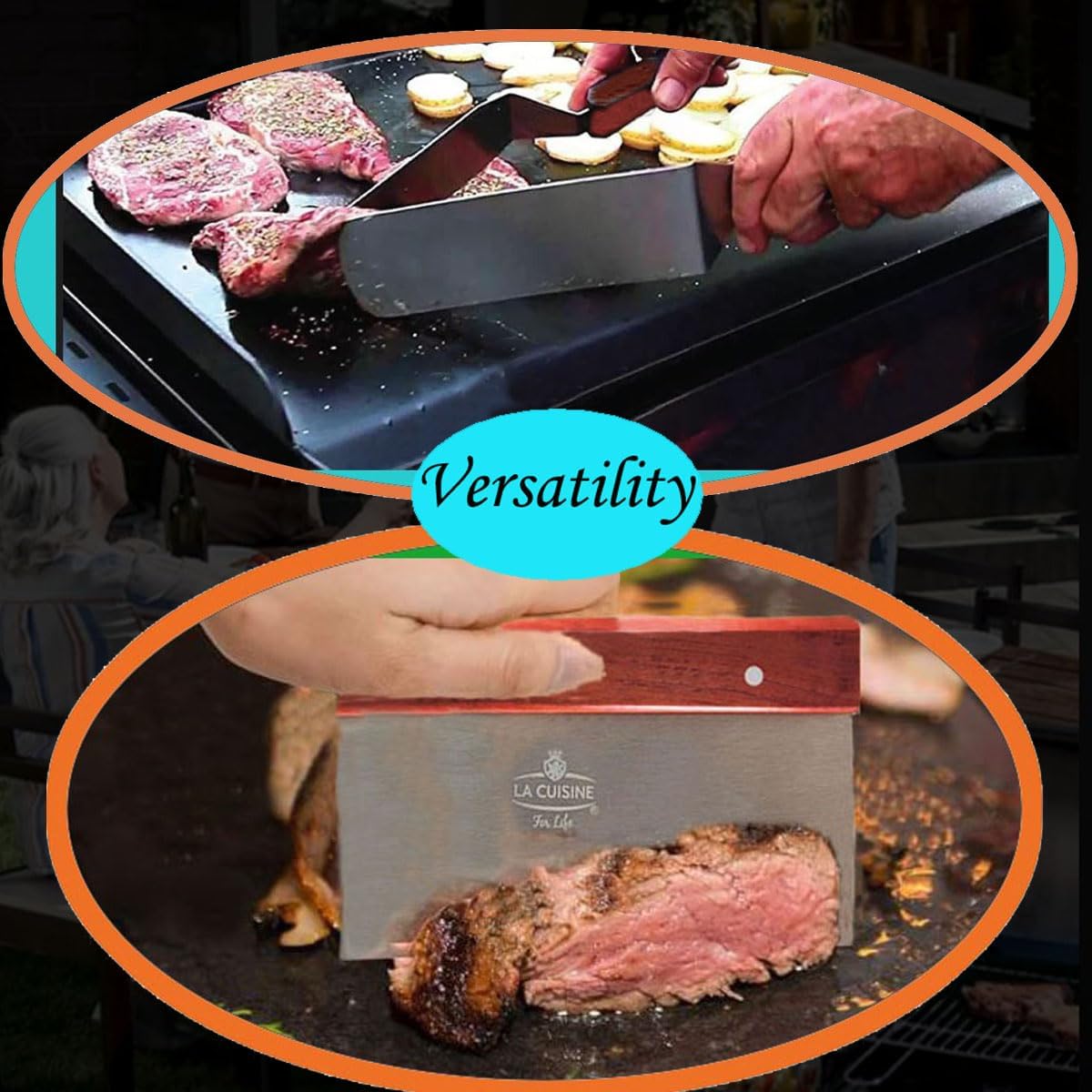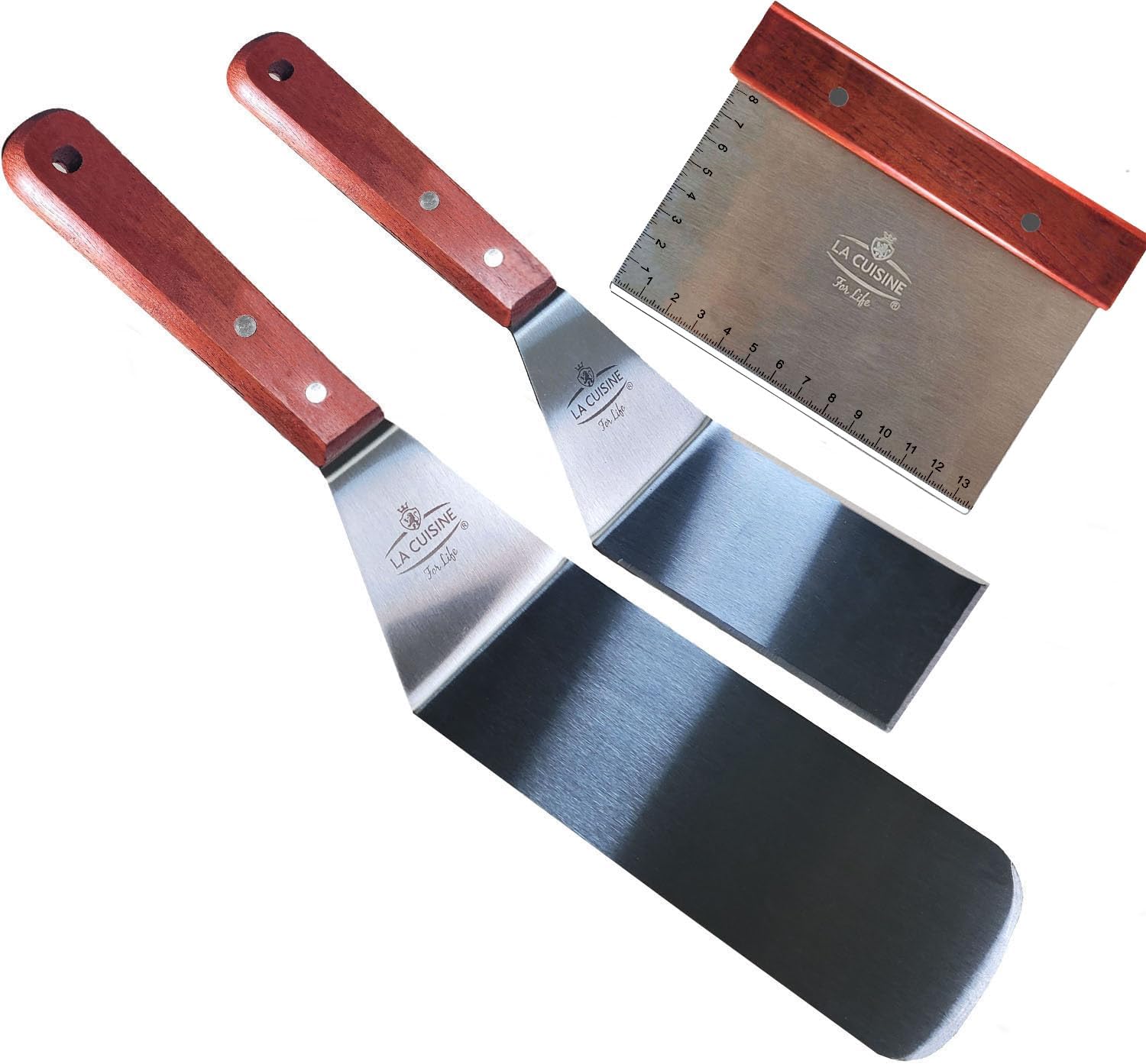 La Cuisine 3-PC SS Griddle Spatula Set - BBQ Tools Set Food Scraper for Grill Teppanyaki Flipping Patties Pancake Fish, 2 pcs SS Spatulas 1 pc Chopper/Scrapper with solid wood handle