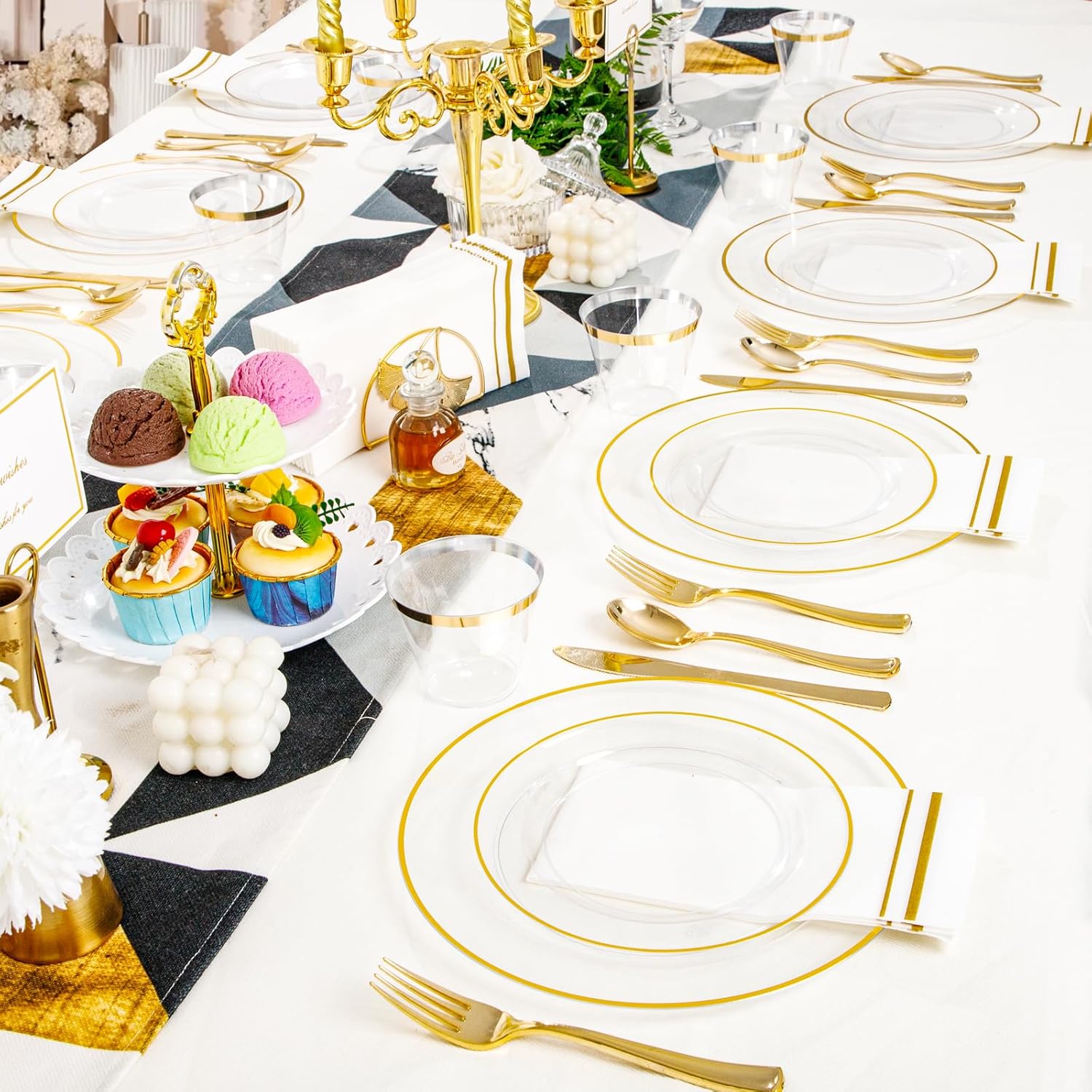 SUT 350Pcs Plastic Dinnerware Set for 50 Guests, Clear and Gold Plastic Plates, Disposable Plates and Napkins Party Supplies, Gold Silverware, Plates, Cups and Napkins Sets for Party Weddings