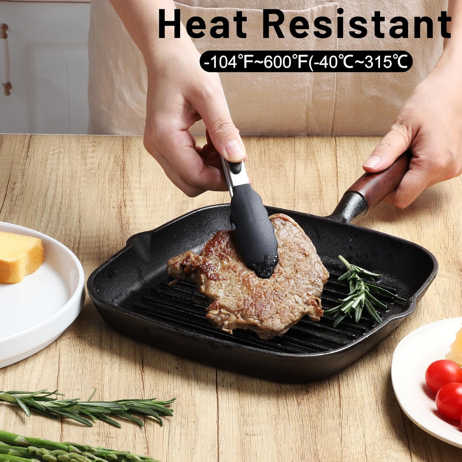 • EASY TO USE: The cooking tongs' handle is cushioned with silicon, good for thumb rest and ensures good grip and control. The Food Grade silicon tongs tip is heat resistance 600°F and less prone to scratch the pan. Easy to rinse, dishwasher safe.
