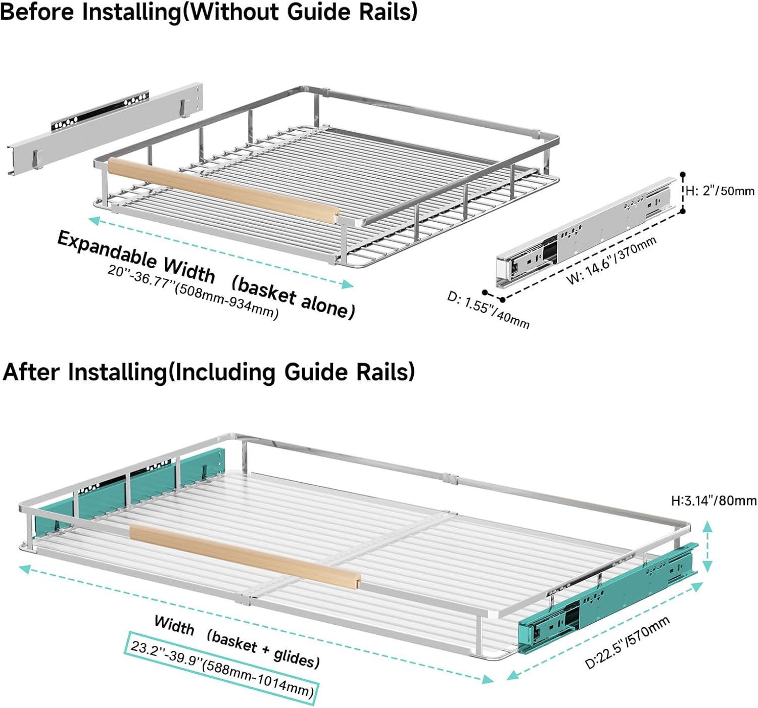 • Sturdy and Reliable Materials: Our pull out drawers for cabinets made of high quality chromed stainless steel, prevent scratches, not easy to rust and deform, and features excellent stability. Smooth surface and chrome color can be matched with various style of cabinets, suitable for variety of family styles.