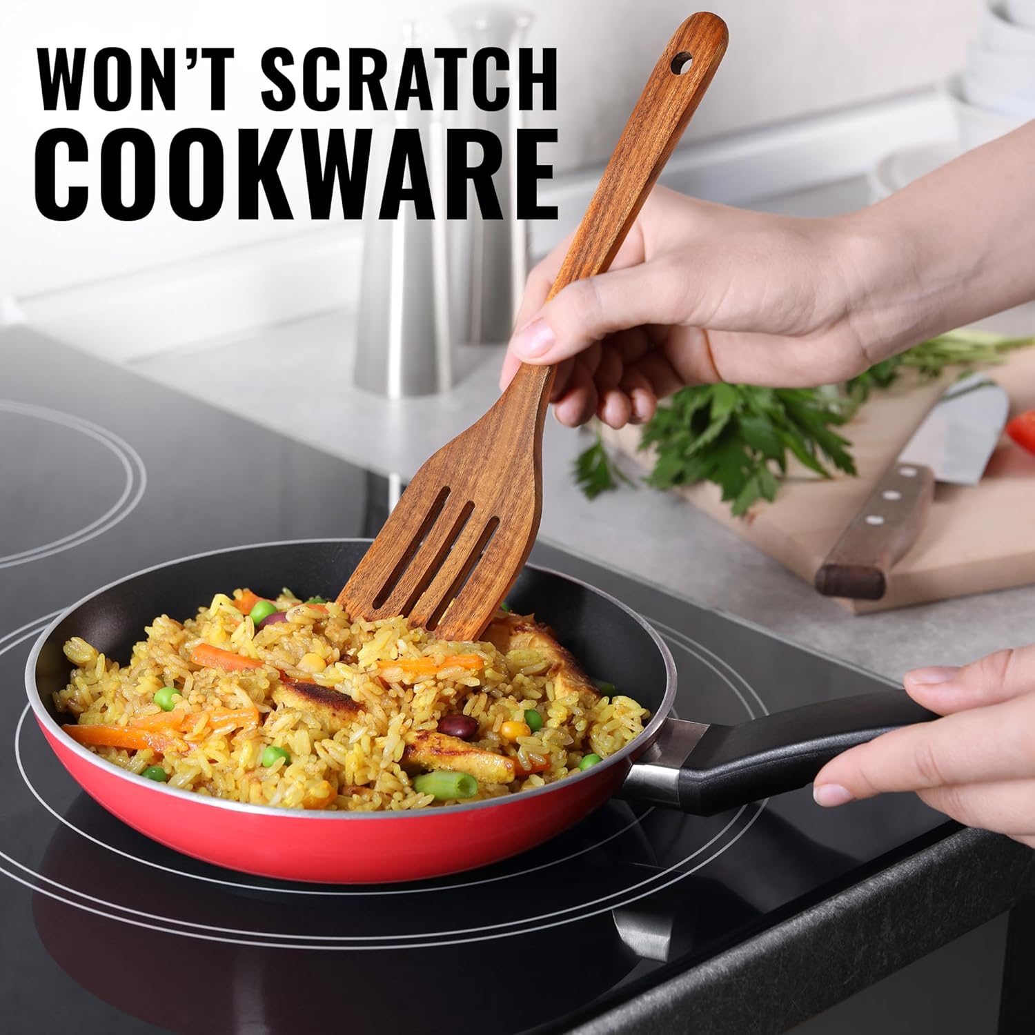 Zulay Kitchen Teak Wood Slotted Spatula – Durable & Heat-Resistant Cooking Utensil for Non-Stick Pans – Wooden Turner for Stirring, Flipping & Serving - Brown