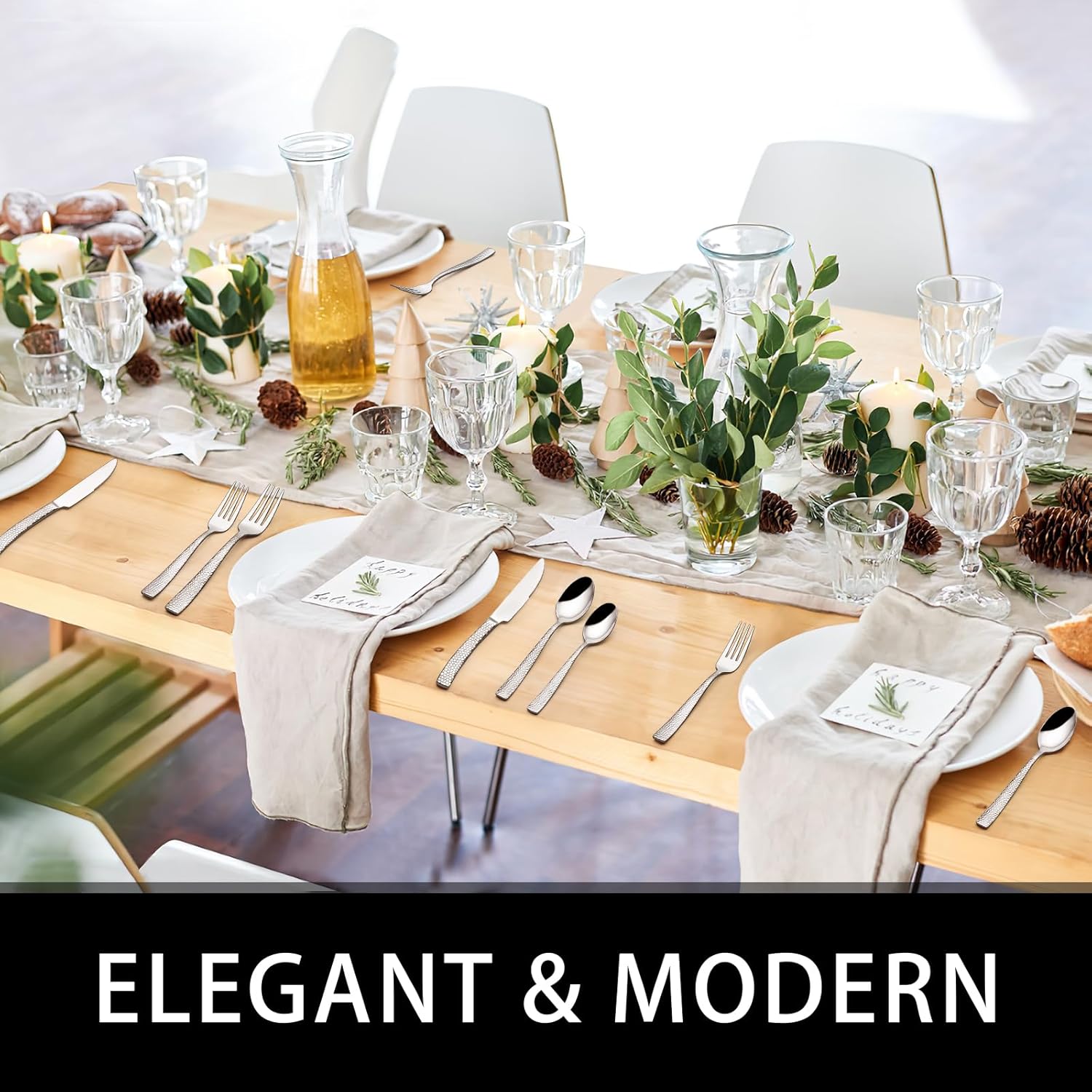 • 【COMFORTABLE DESIGN】: This flatware set has a classic silhouette with clean lines and polish-finish surface in all silver, a good choice to go with your existing tableware. The smooth edge of the handle is pleasure to hold, appropriate weight and perfect balance are added to ensure maximum comfort during use.